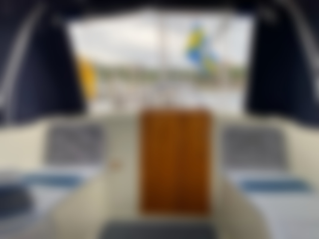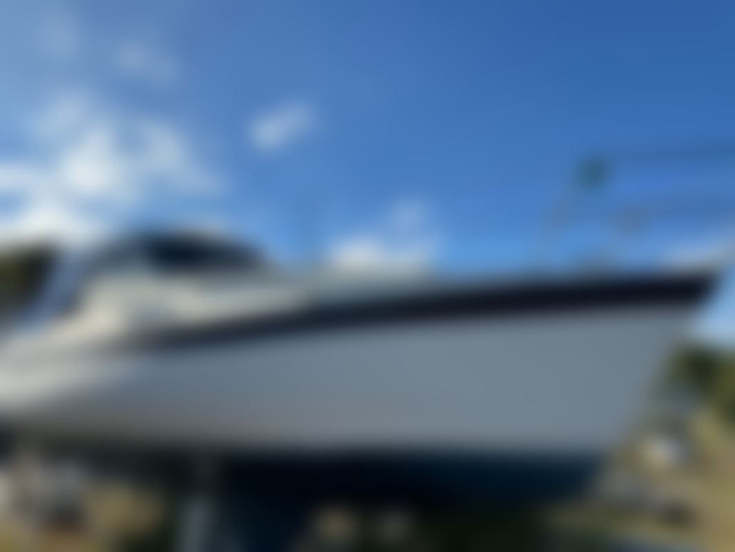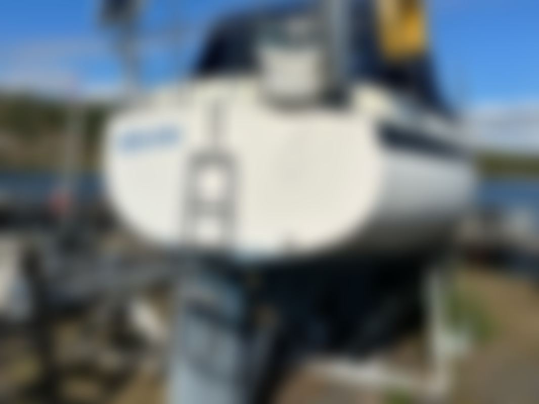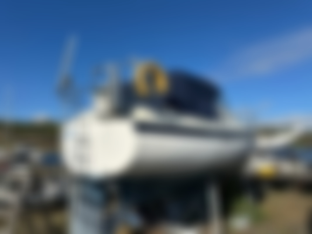 AllowedAlbin Motorseglare Olivia står uppställd på land i en båthamn. Båten är vit med blå rand och har blått "nyare" kapell över cockpit. På akterdäck finns en solpanel monterad, samt livräddningsutrustning och en livboj.