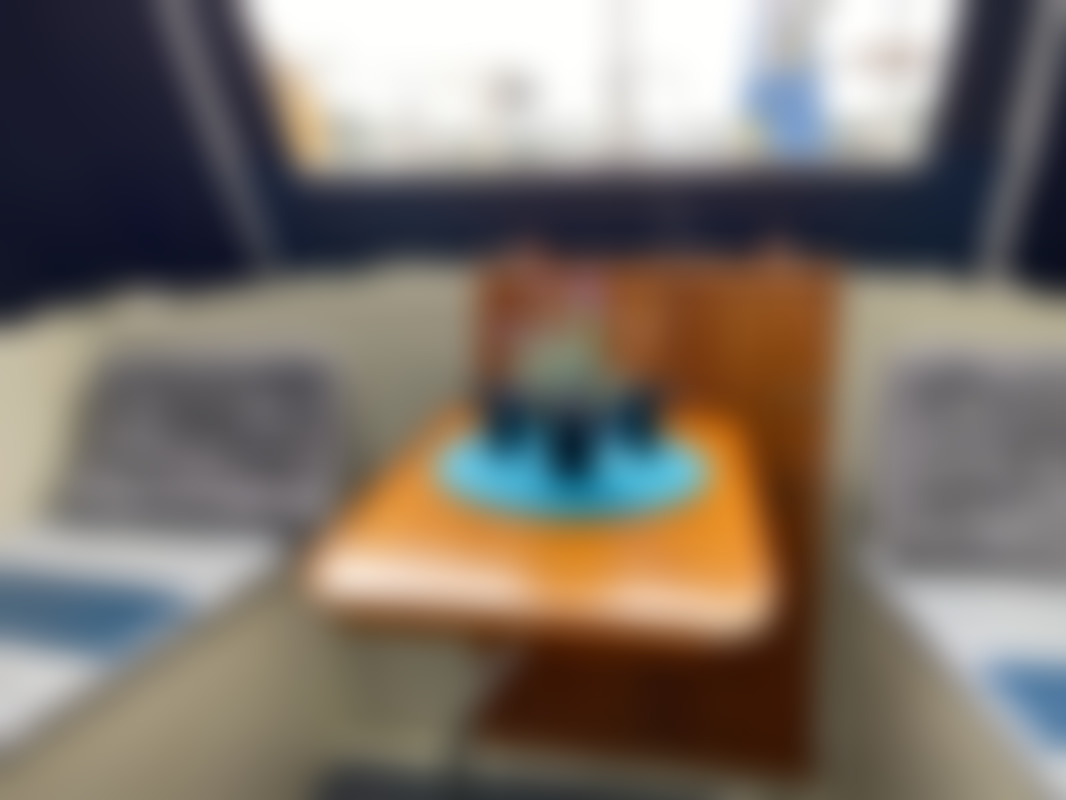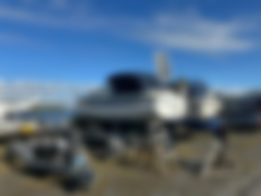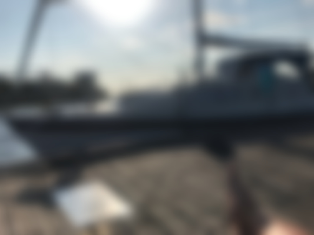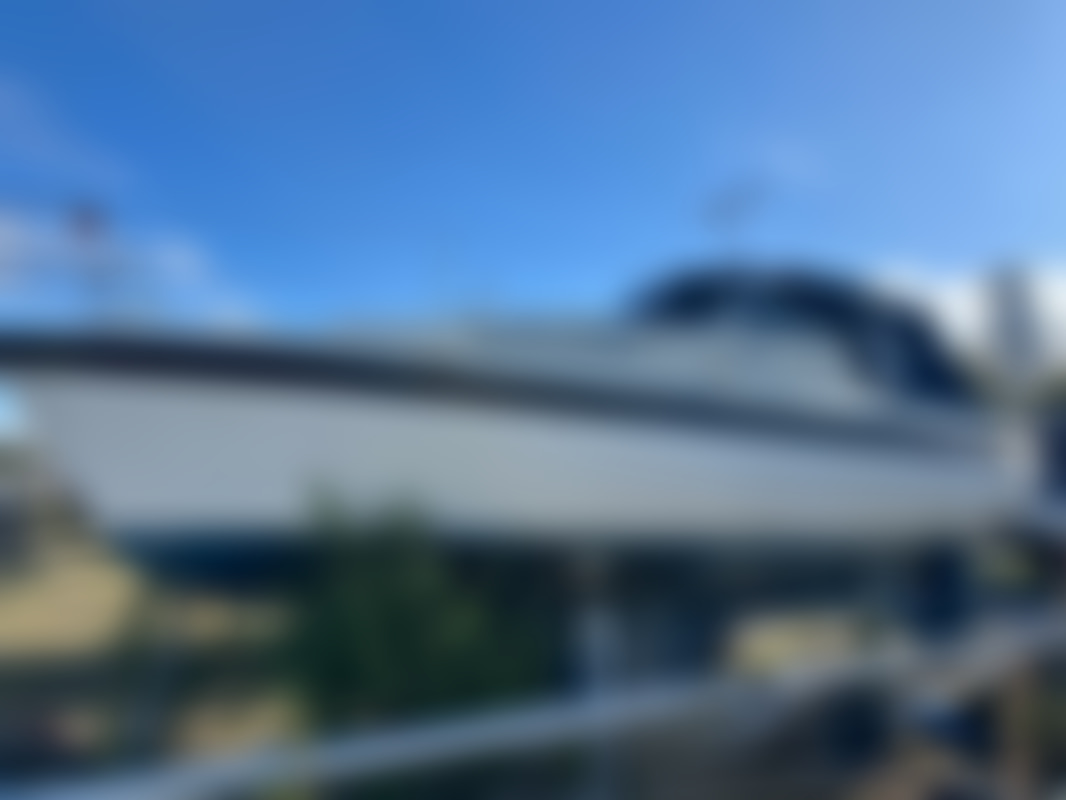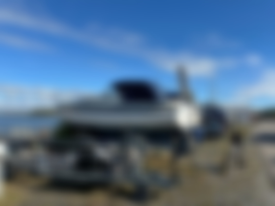 AllowedAlbin Motorseglare Olivia står uppställd på land i en båthamn. Båten är vit med blå rand och har blått "nyare" kapell över cockpit. På akterdäck finns en solpanel monterad, samt livräddningsutrustning och en livboj.