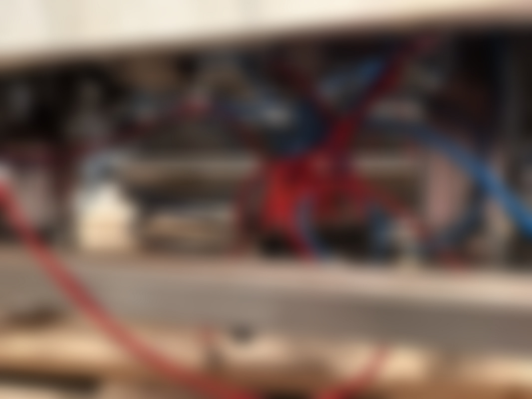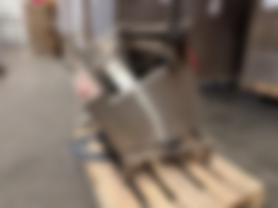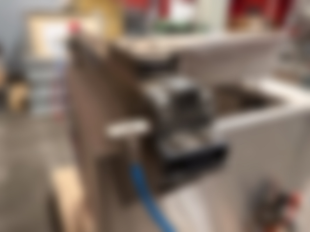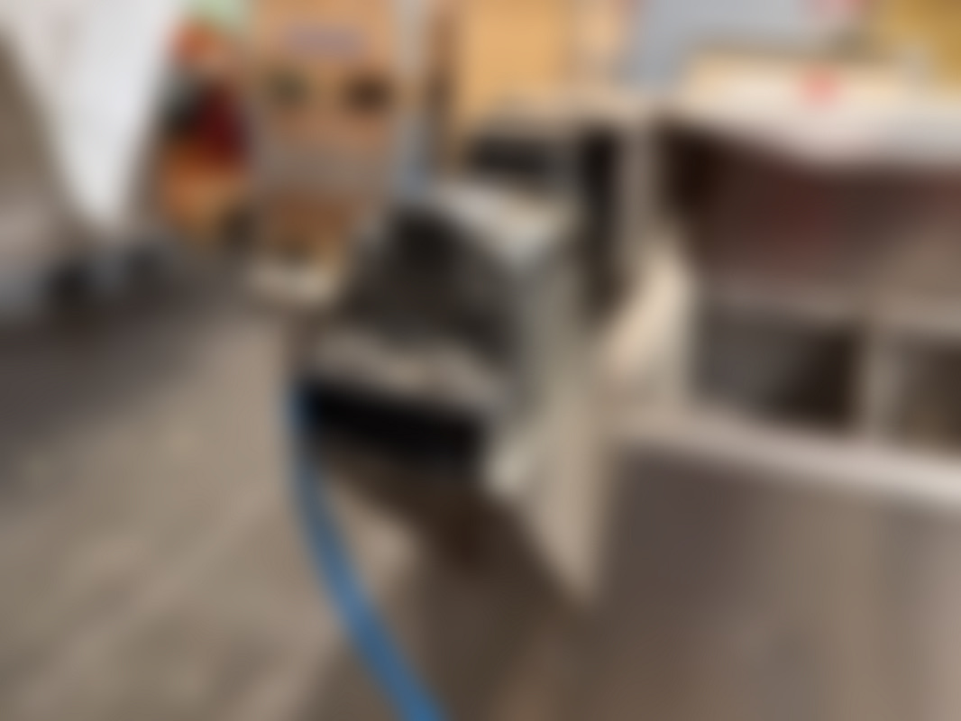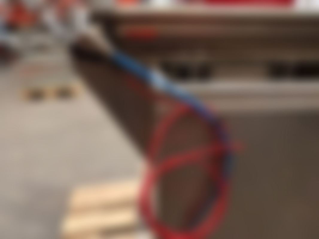 Not allowedIndustriell rostfri kartongresningsmaskin med hydrauliksystem och flera kopplingar. Utrustad med fotpedal, tryckmätare och blå och röda hydraulslangar.