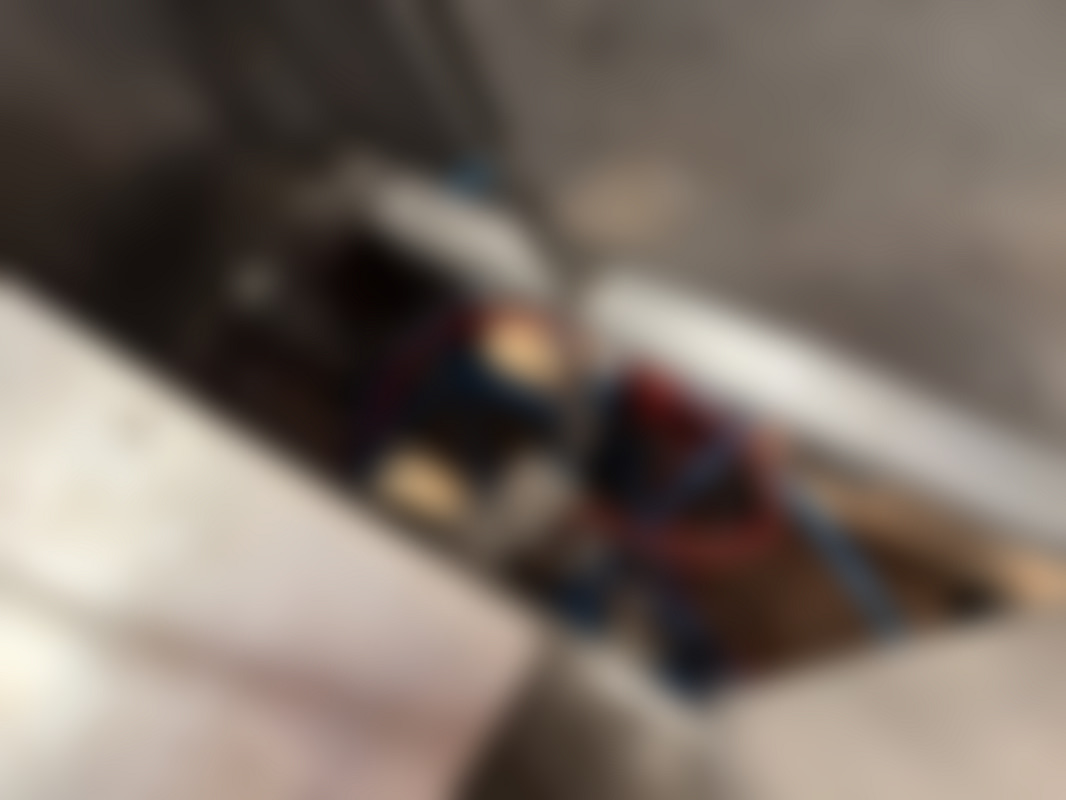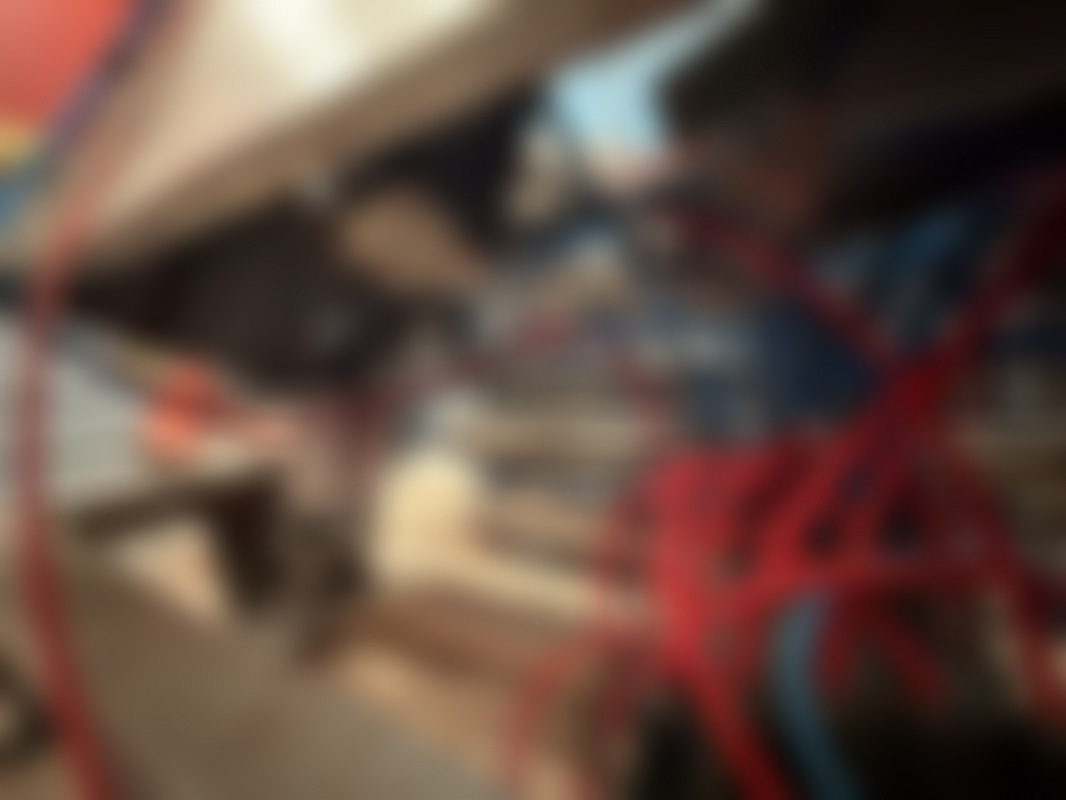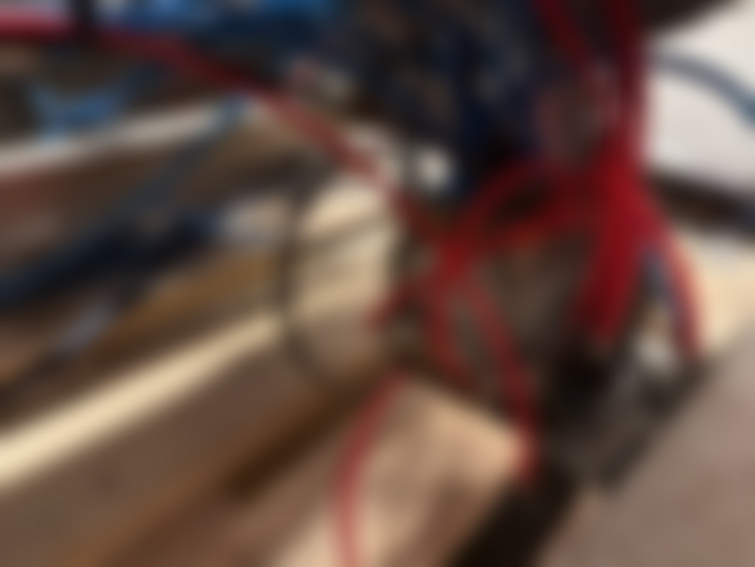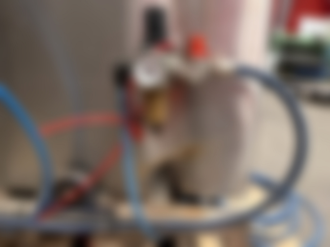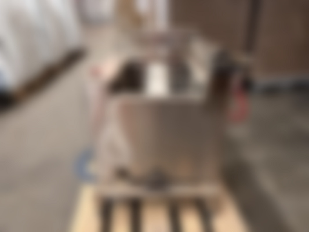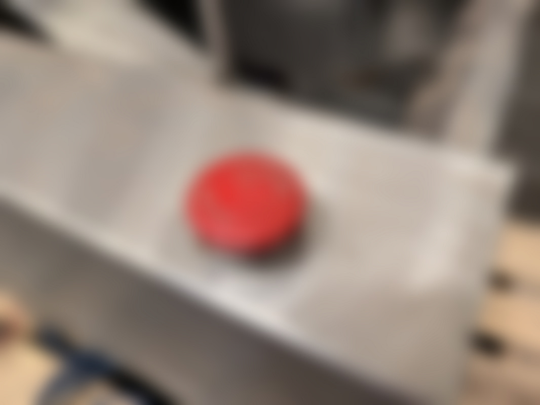 Not allowedIndustriell rostfri kartongresningsmaskin med hydrauliksystem och flera kopplingar. Utrustad med fotpedal, tryckmätare och blå och röda hydraulslangar.