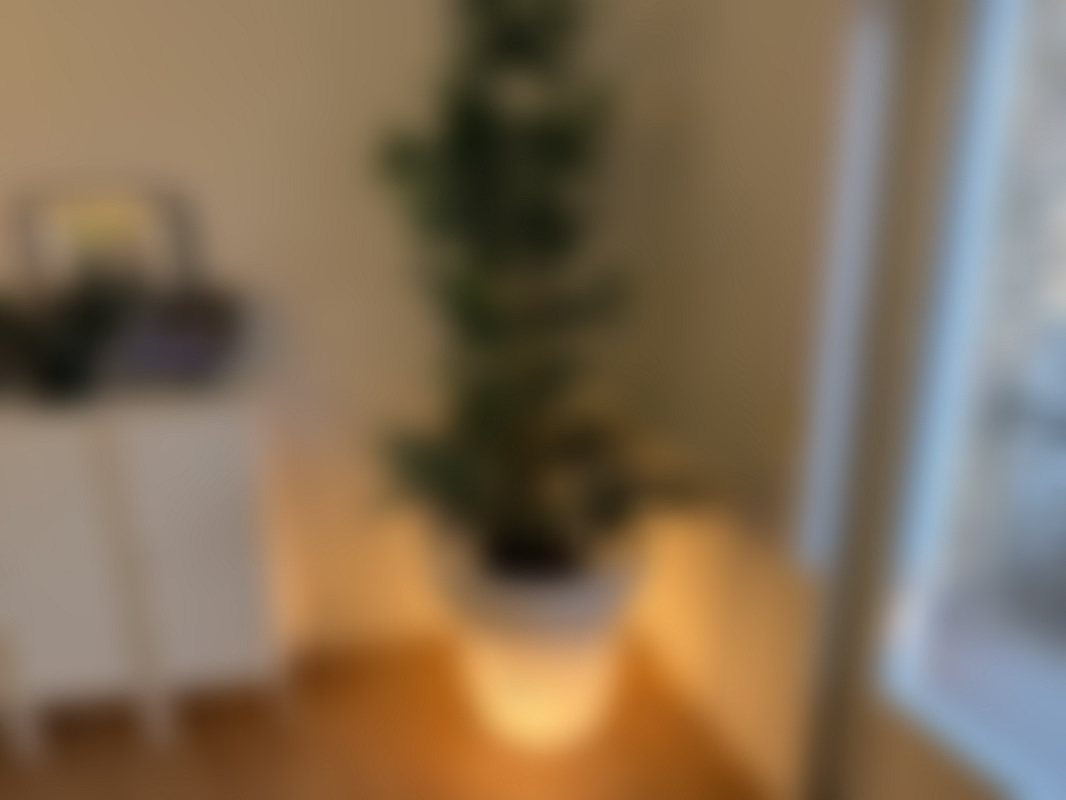 Belyst plastkruka med plastväxter och timer.