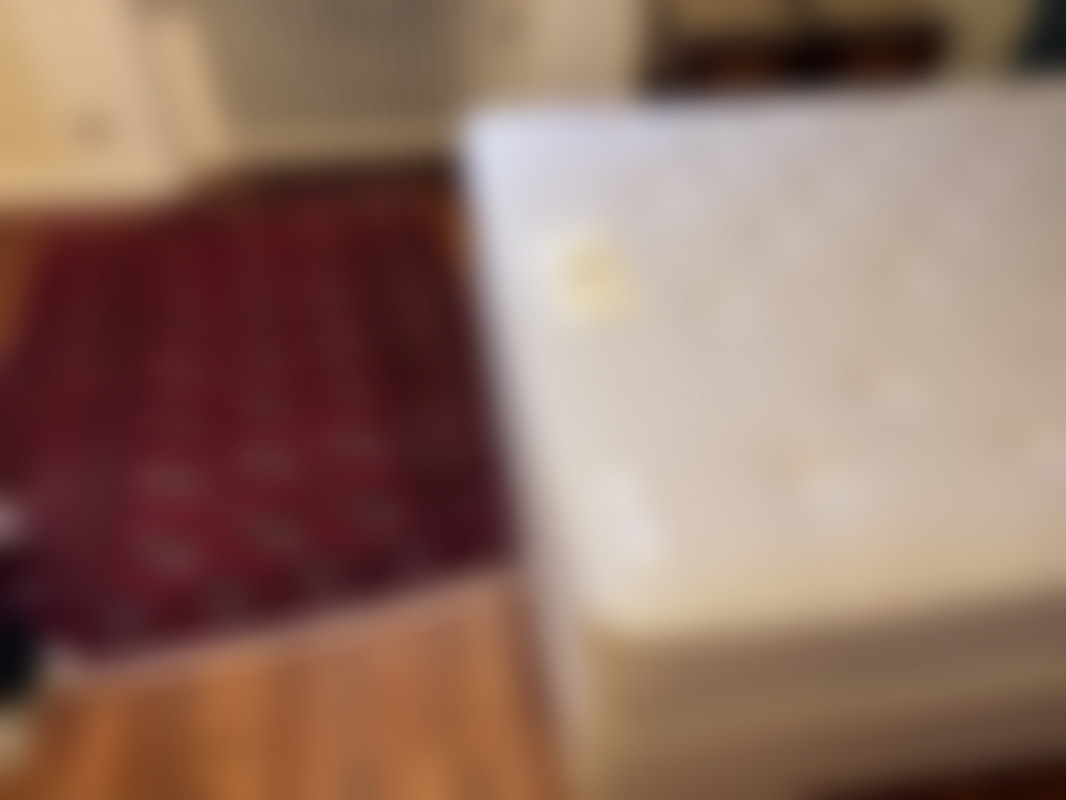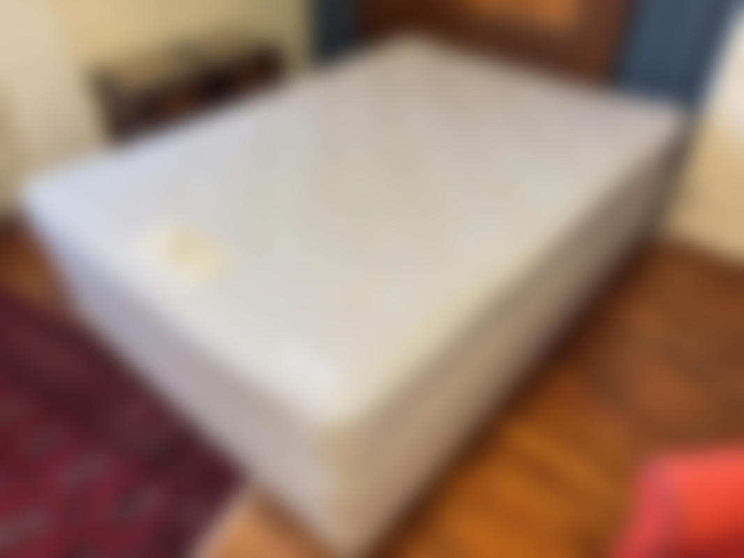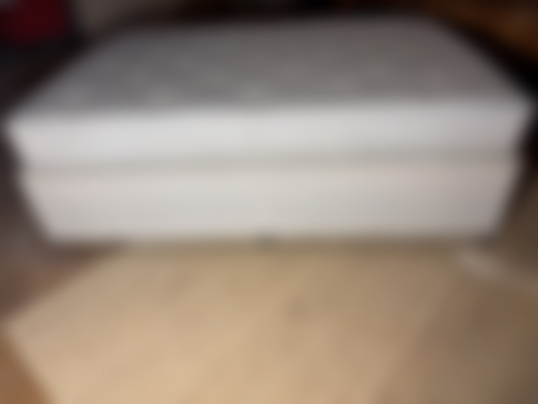 Sänggavel medföljer ej. Sängen går ej in i hissen. Sängen står en trappa upp.