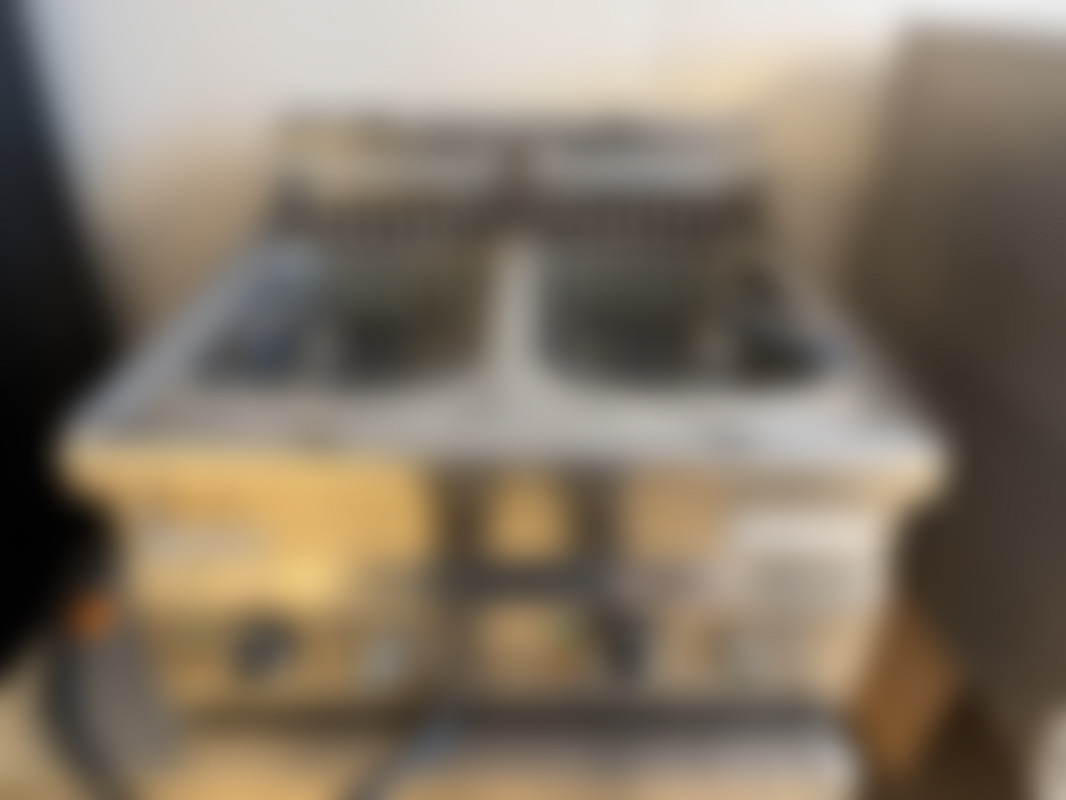Not allowedDubbel fritös av rostfritt stål från Modular, utrustad med två nätkorgar och separata temperaturreglage. Enheten har handtag och kabelanslutning.