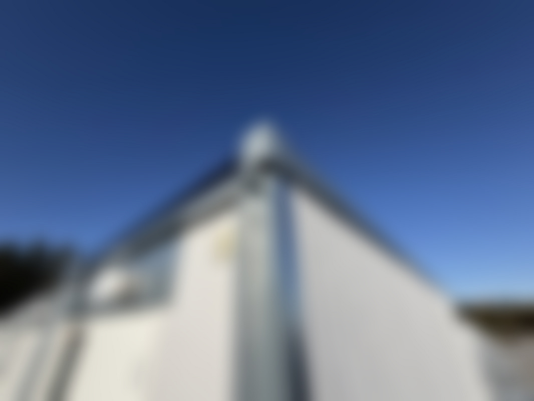 Låglutande takkonstruktion med svagt fall åt vardera håll i modulens längdriktning. Takytan består av papp.