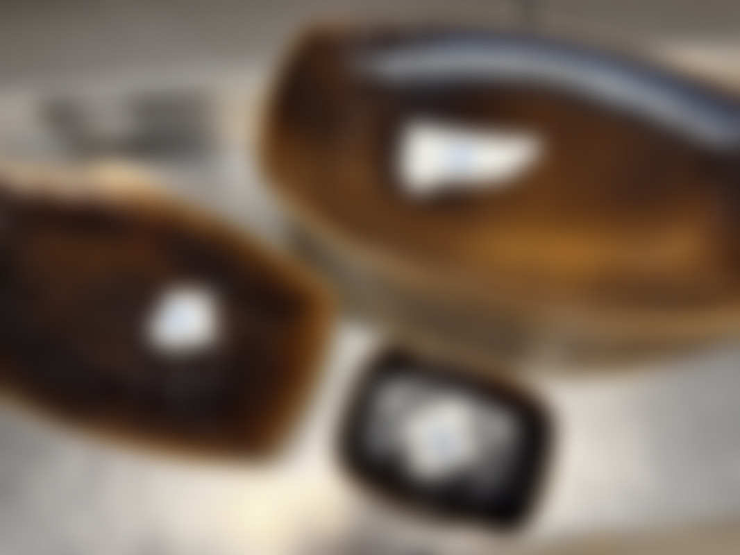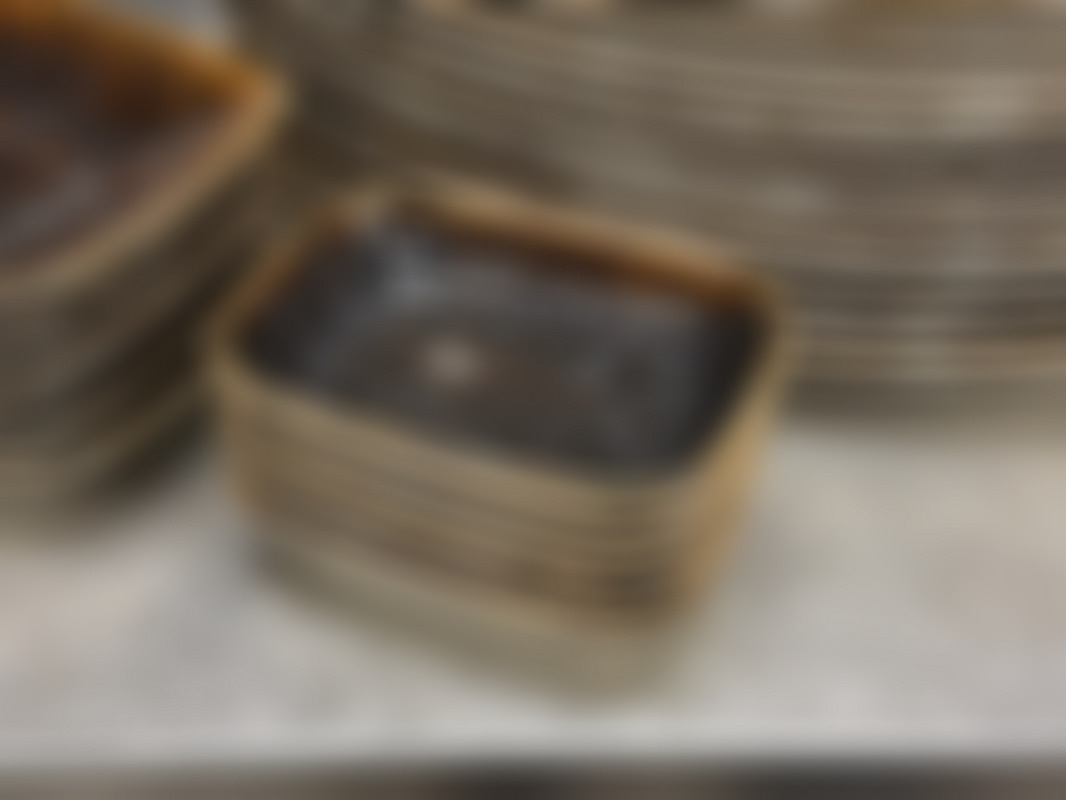 Består av flera ovalformade tallrikar i olika storlekar samt små skålar i brun glasyr med mörk dekor.