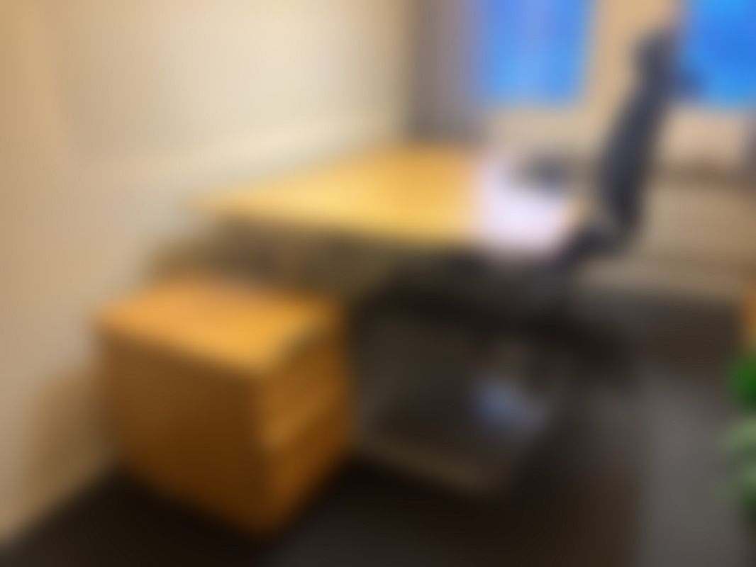 Kontorsplats med skrivbord, stol och skåp.
