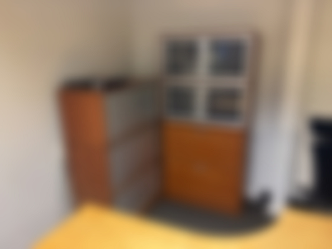Kontorsplats med skrivbord, stol och skåp.