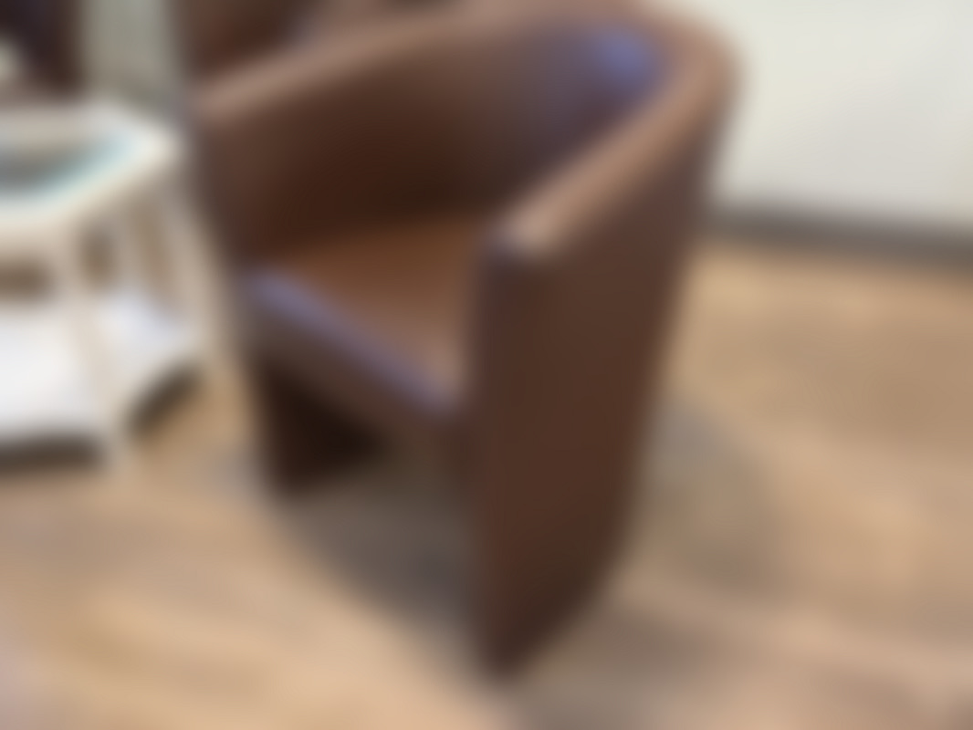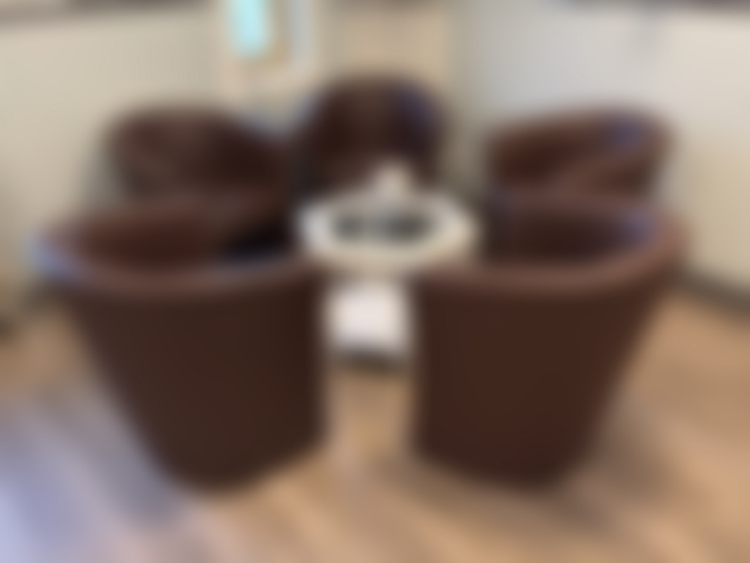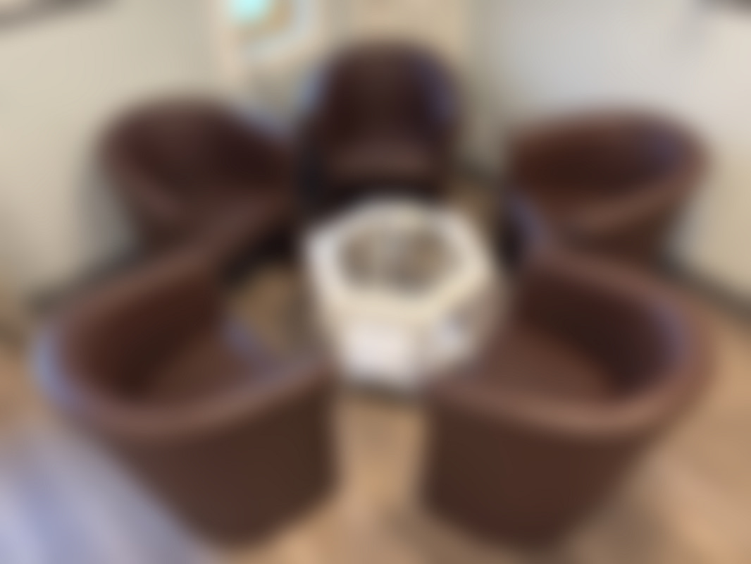 Not allowedSittgrupp i brun konstläder med fem fåtöljer runt ett vitt åttkantigt glasbord.