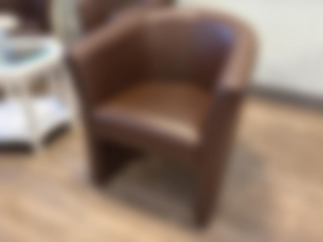Sittgrupp med 5 fåtöljer i brunt konstläder samt bord