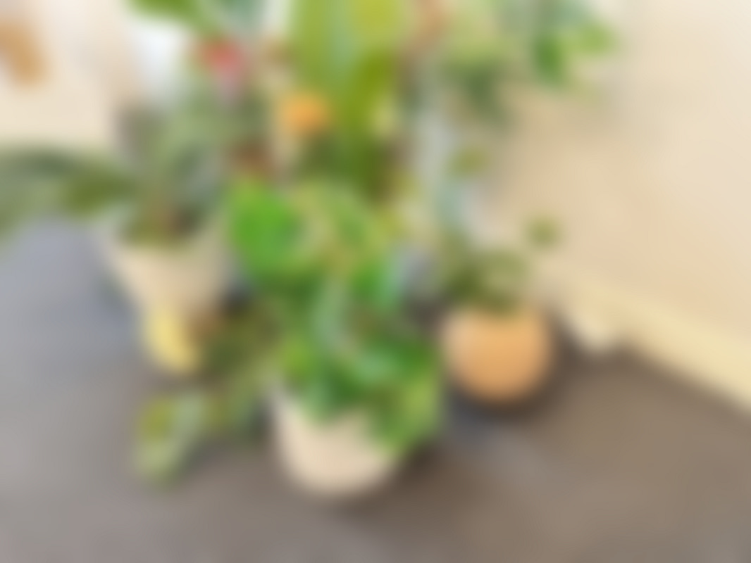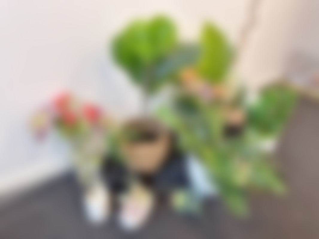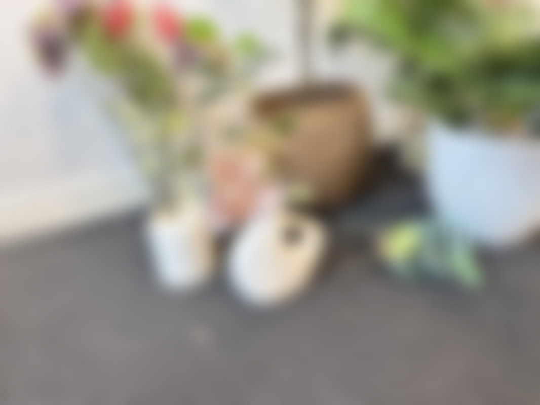 Parti med krukor, vaser och plastblommor