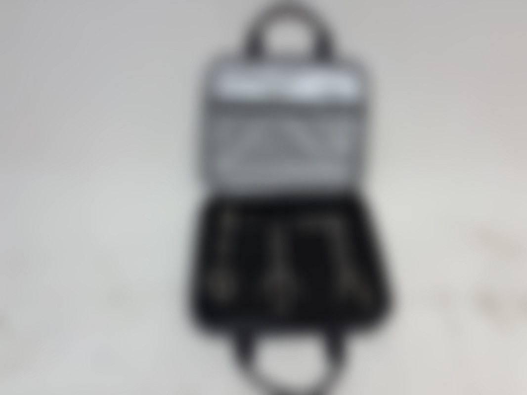 Rostfritt bergkilskit som består av tre olika kilar och en hammare med tillhörande väska.