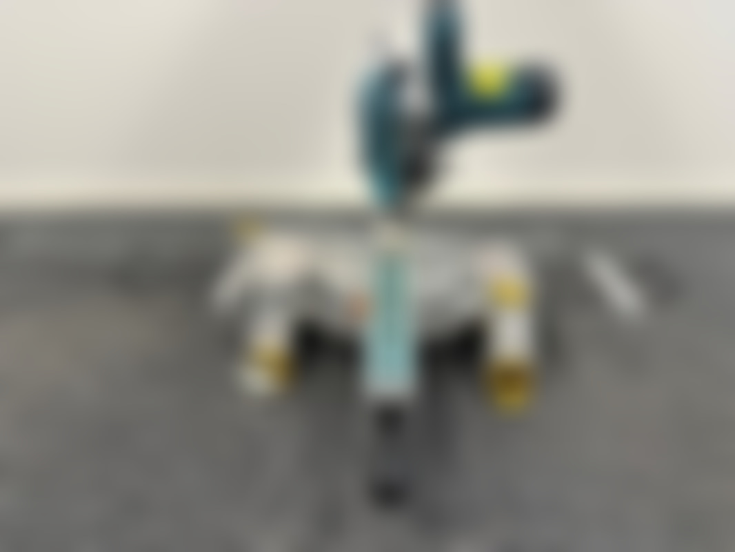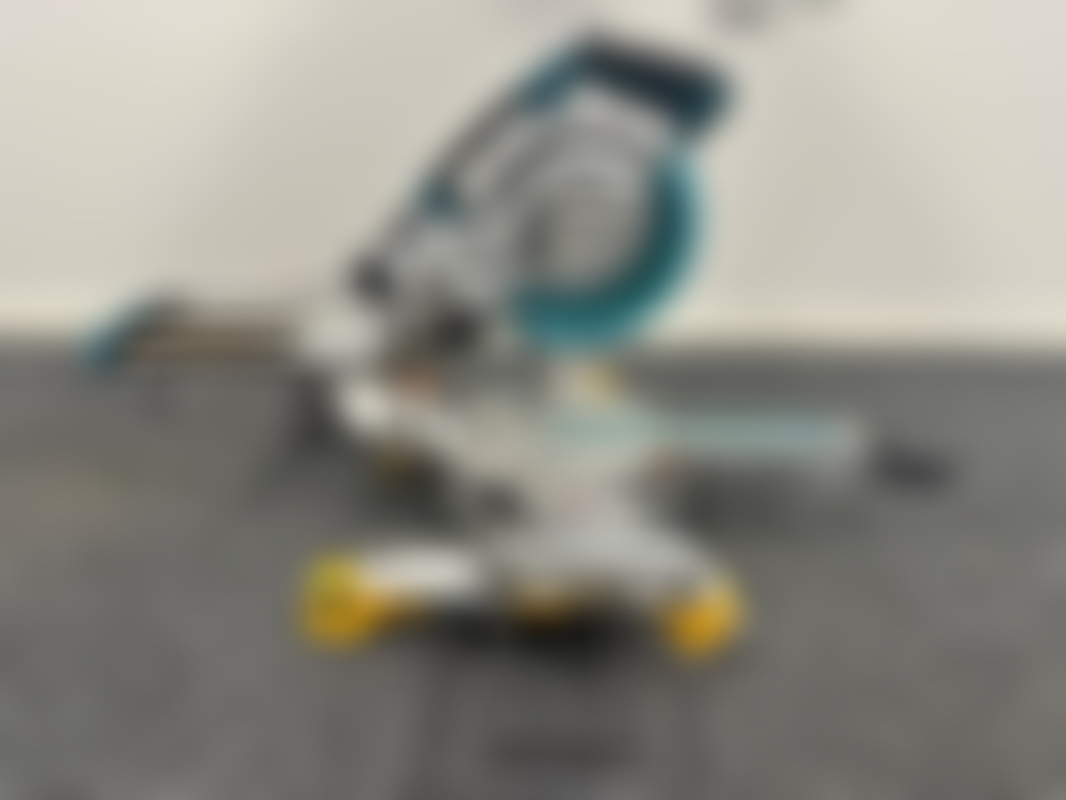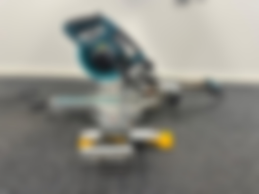 MakitaEldriven kap- och gersåg från Makita, modell LS0815FL, (2020), och monteringsbyglar från Dewalt, modell DE7023-XJ, (u.å.). Sågen är utrustad med en röd laser och har monteringsbyglarna fästa i sig.