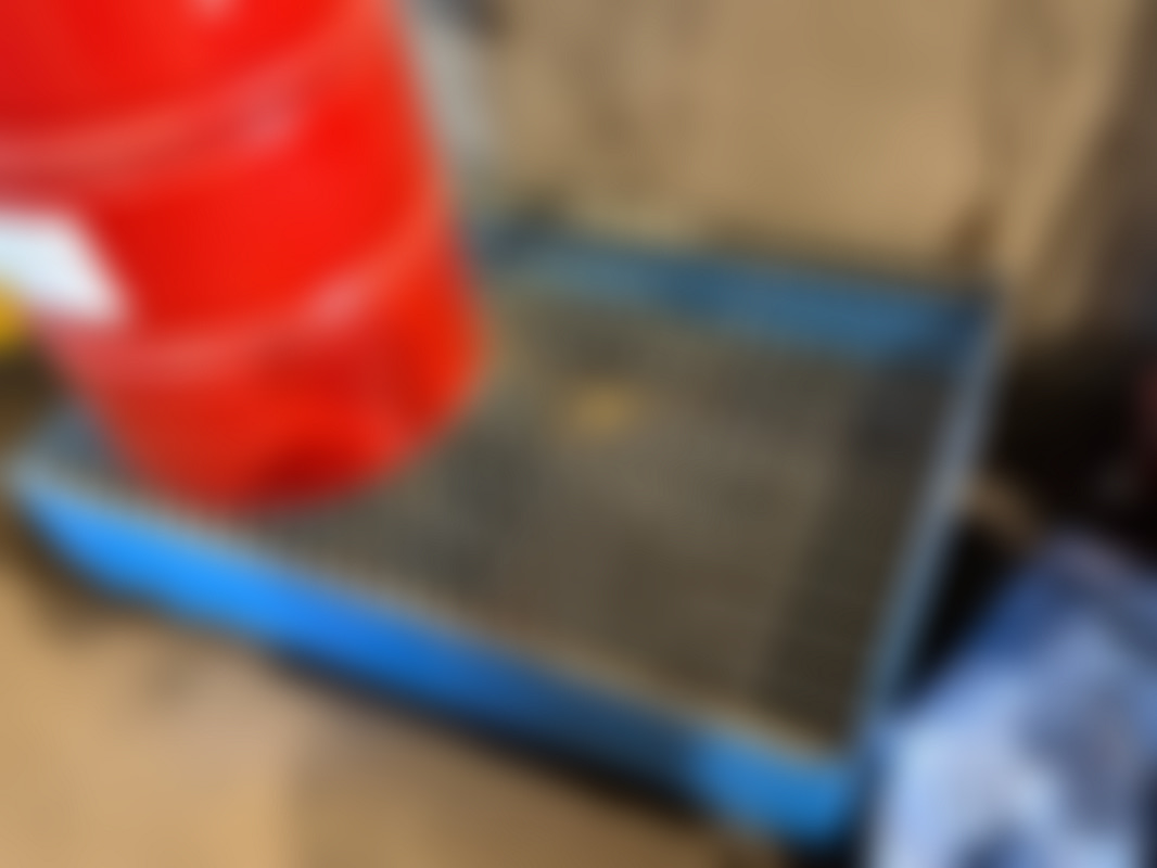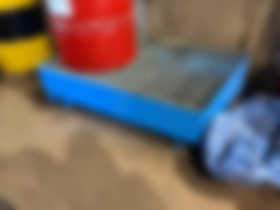 Not allowedSpilloljetråg i blå metall med gallerplattform.