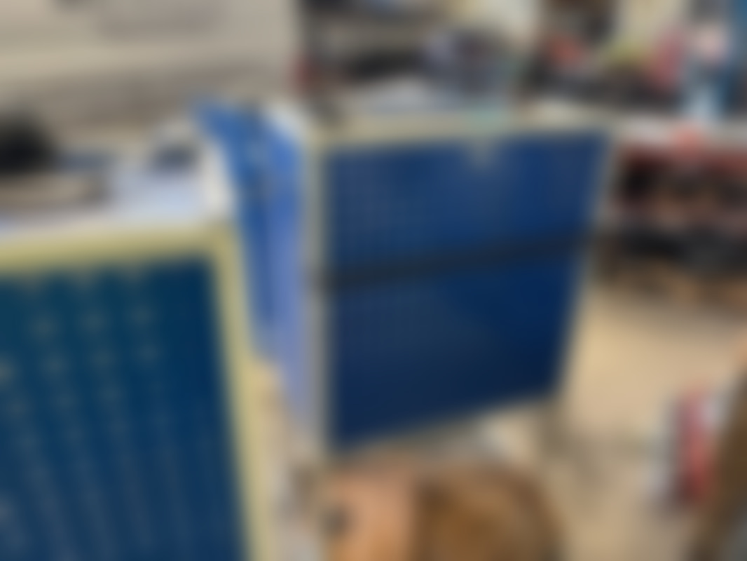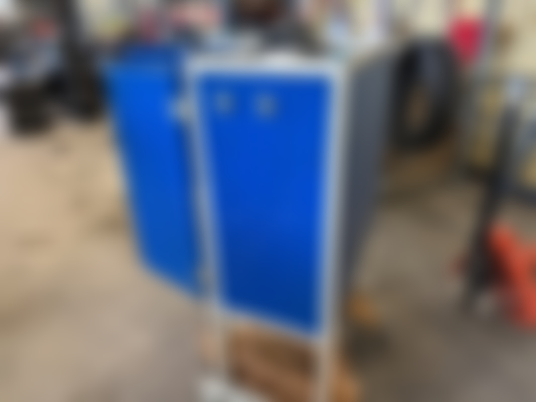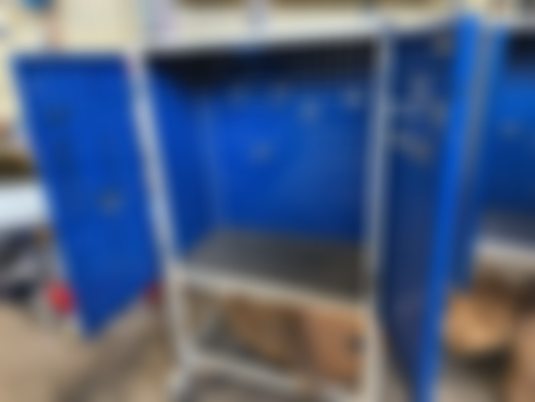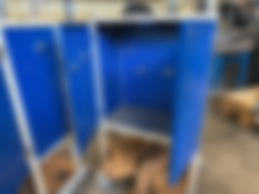 Not allowedTvå blåa verktygsvagnar på hjul med perforerad pegboard-panel. Varje vagn har dörrar med lås, övre arbetsyta och nedre hylla för förvaring av verktyg och tillbehör.