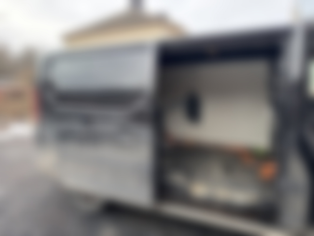 Bakdörrar stänger ej, fastspända med spännband från insidaBula skåp vänster sida
