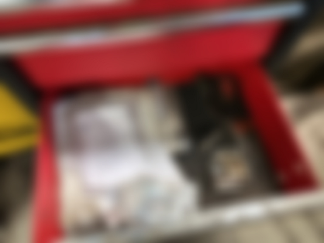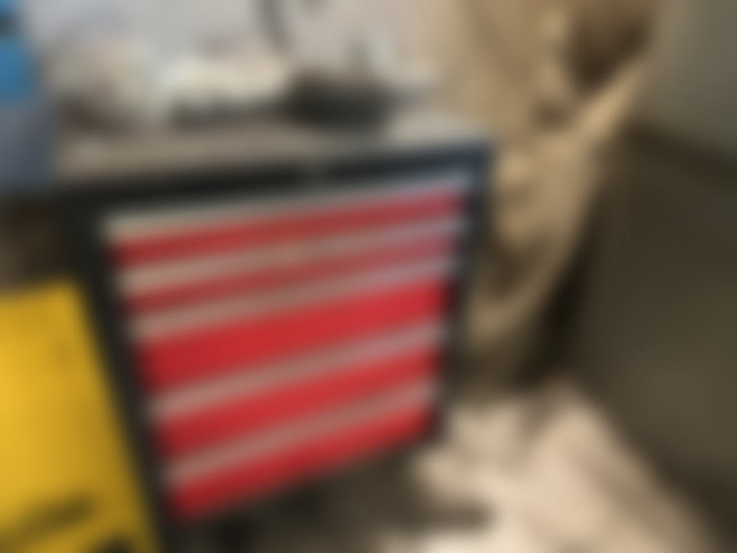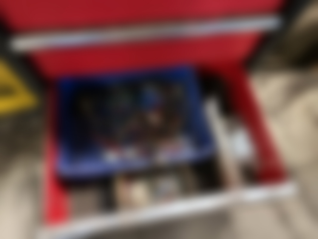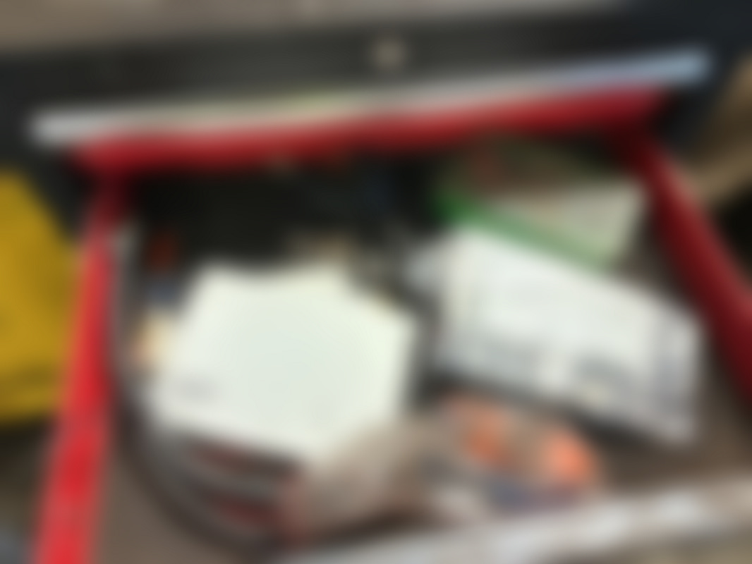 Not allowedRött och svart verktygsskåp med sex lådor. På topp och i lådorna ligger kablar, elektronikdelar och olika verktyg i lådorna ingår.
