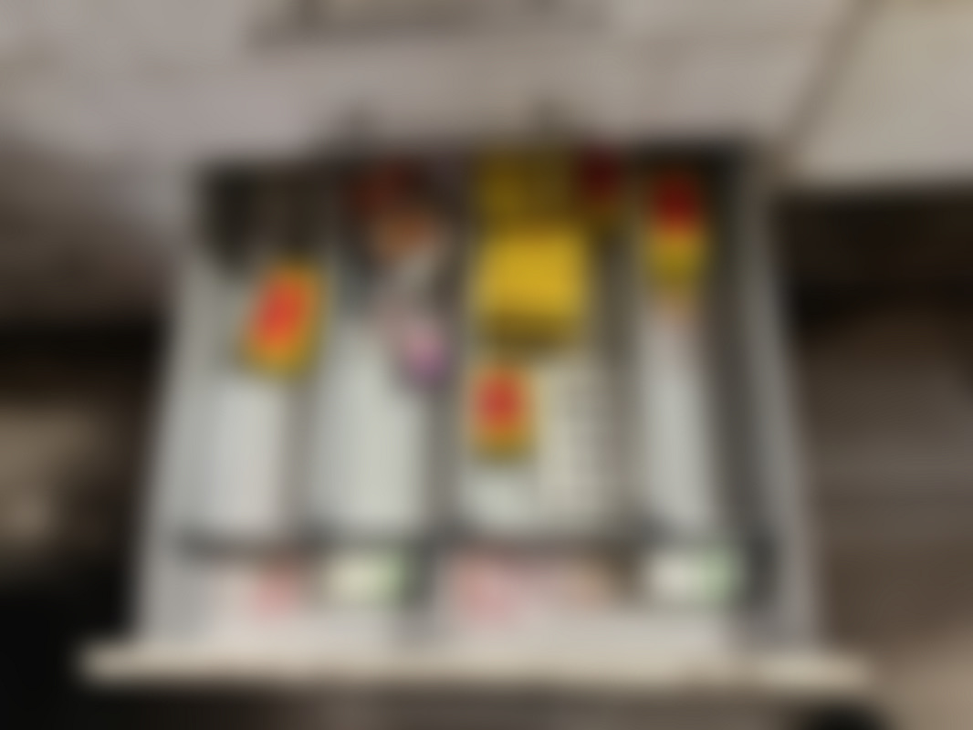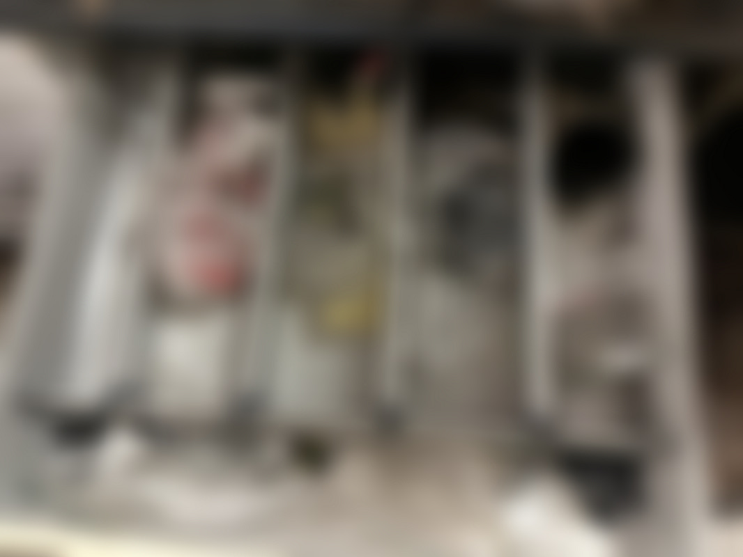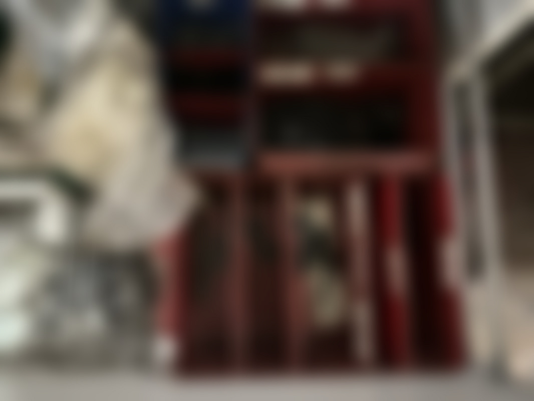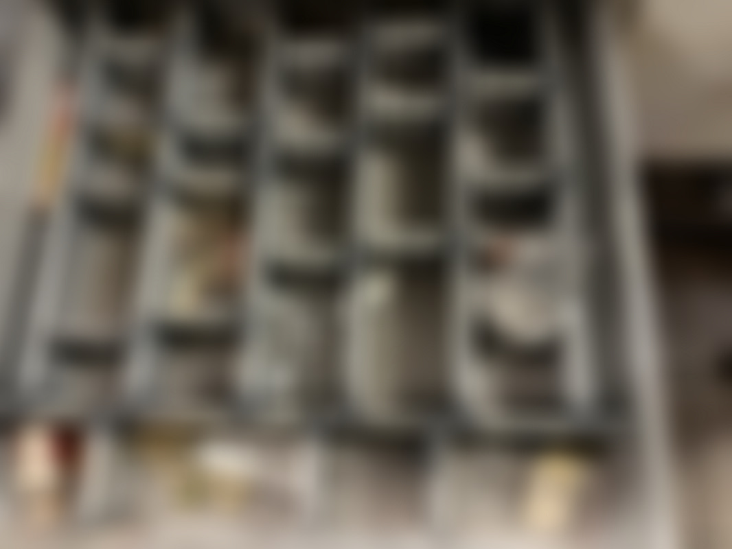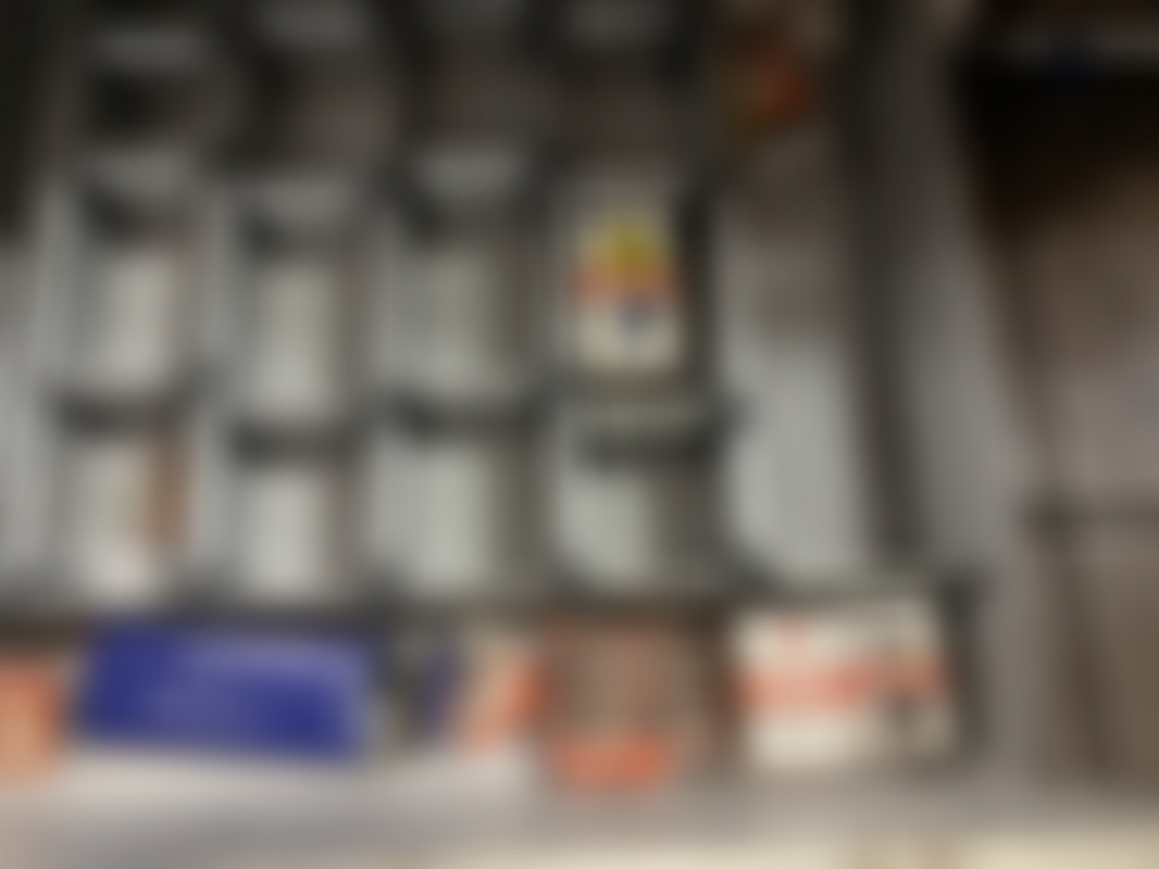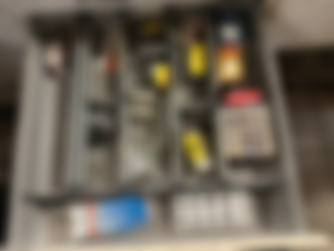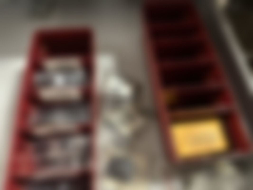 Not allowed”Bänk” med bilrelaterade delar från en verkstad. Innehåller lådor med smådelar, fästen och kopplingskomponenter, samt OSRAM-lampor och andra tillbehör i olika förpackningar.