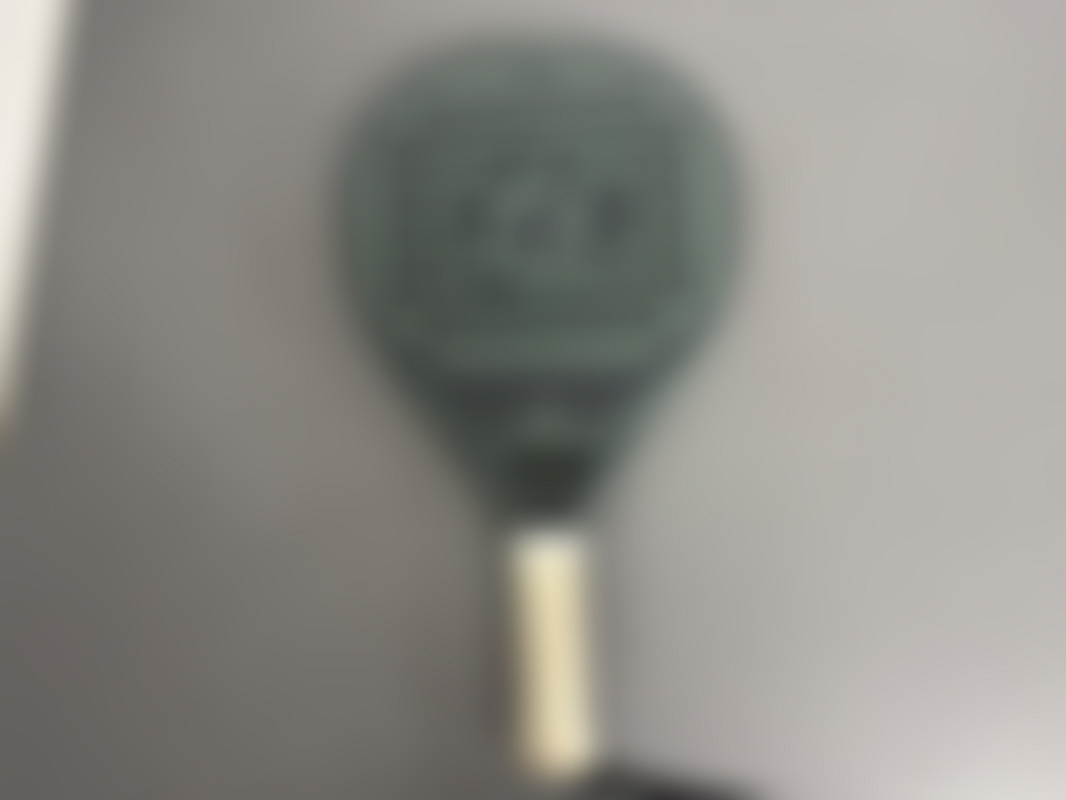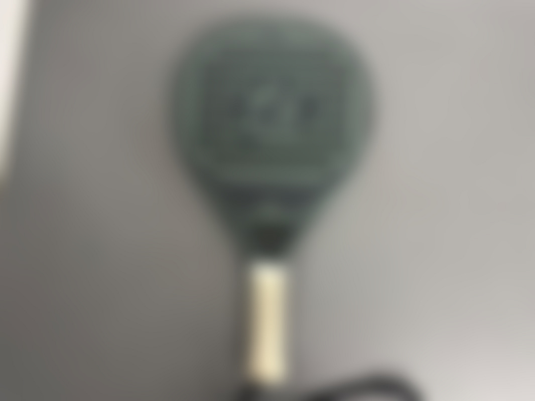 Ett mörkgrönt padelracket, modell Scorpio, tidigare använt och har en större skada på ena kanten.