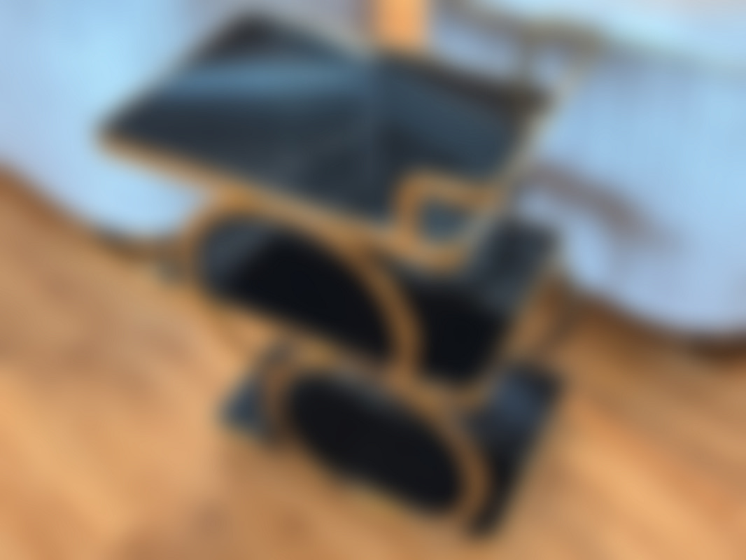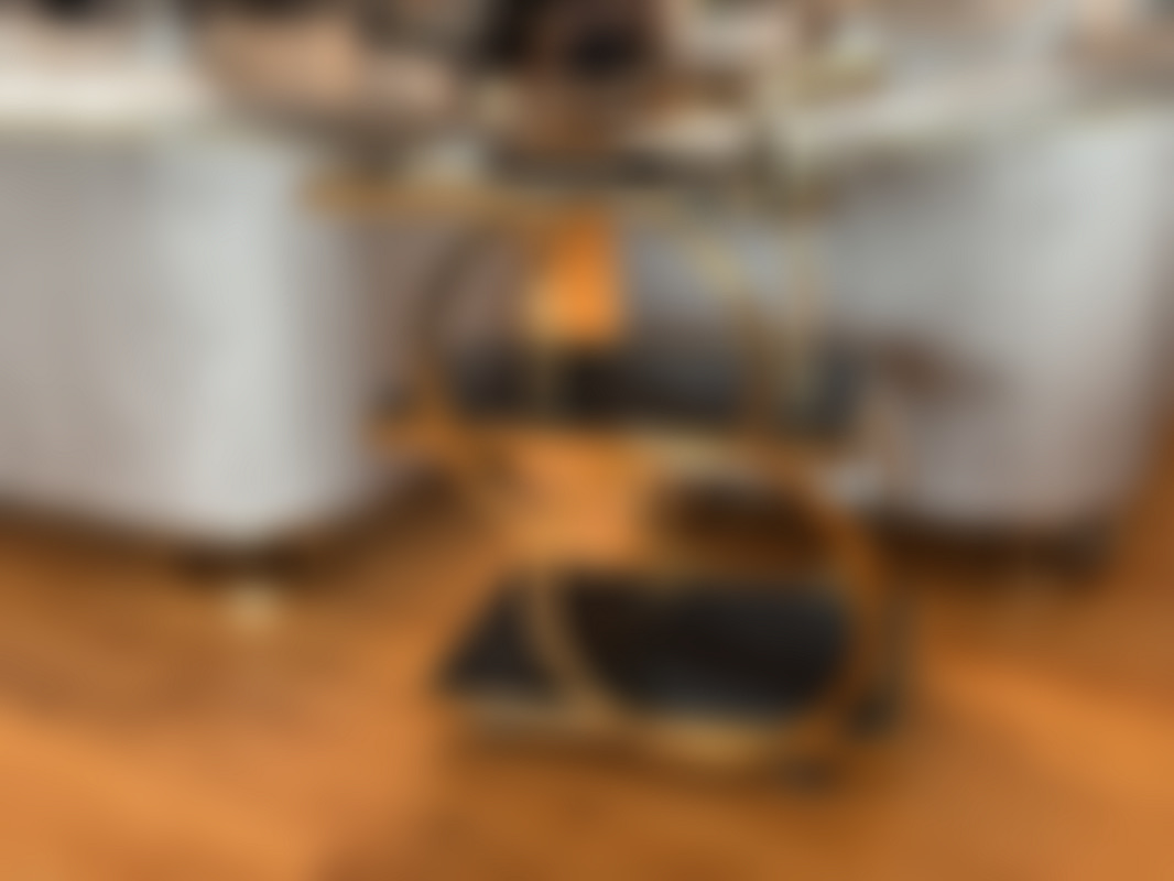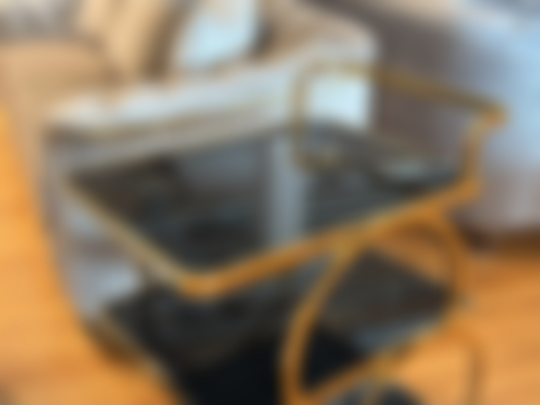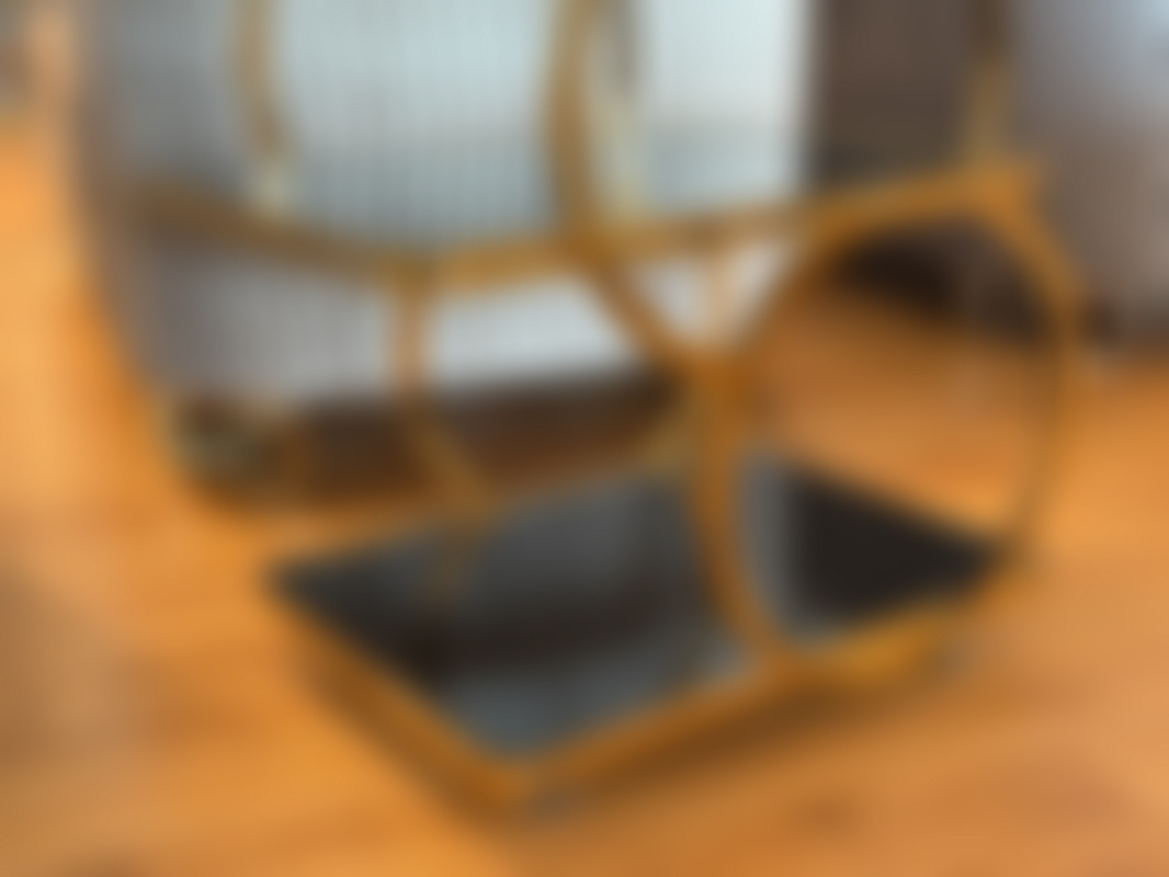 Not allowedDrinkvagn med stomme i guldfärgad metall med svarta skivor i glas.