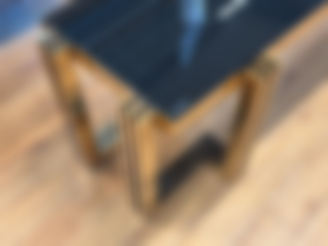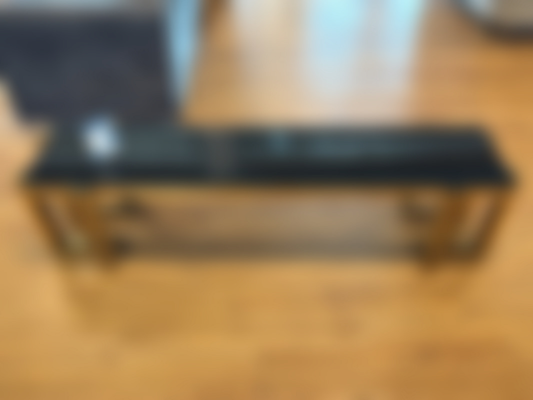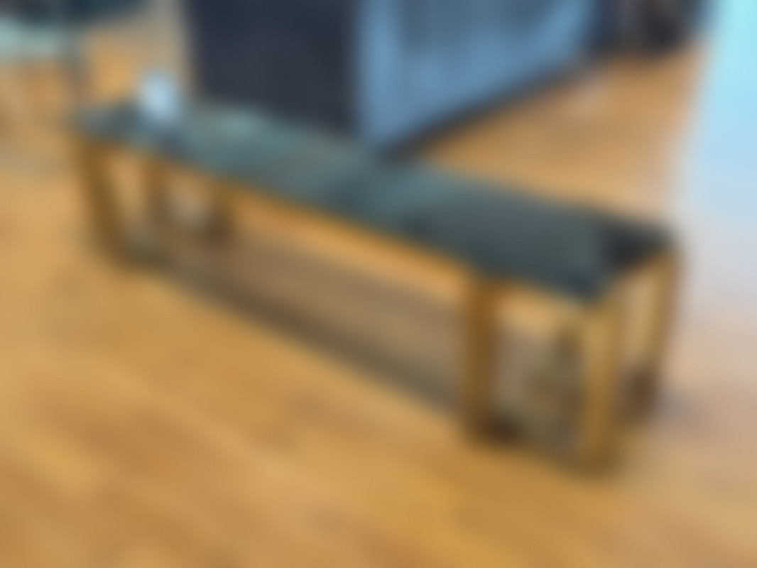 Not allowedTV-bänk/ sidobänk med stomme i guldfärgad metall och skiva i svart glas.