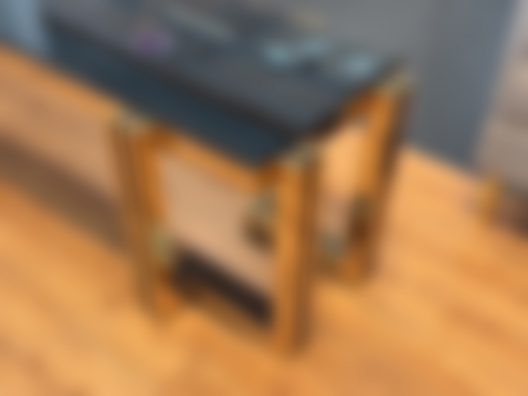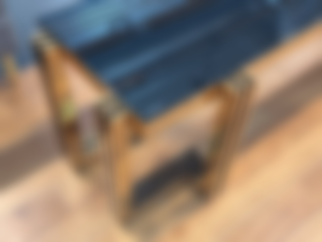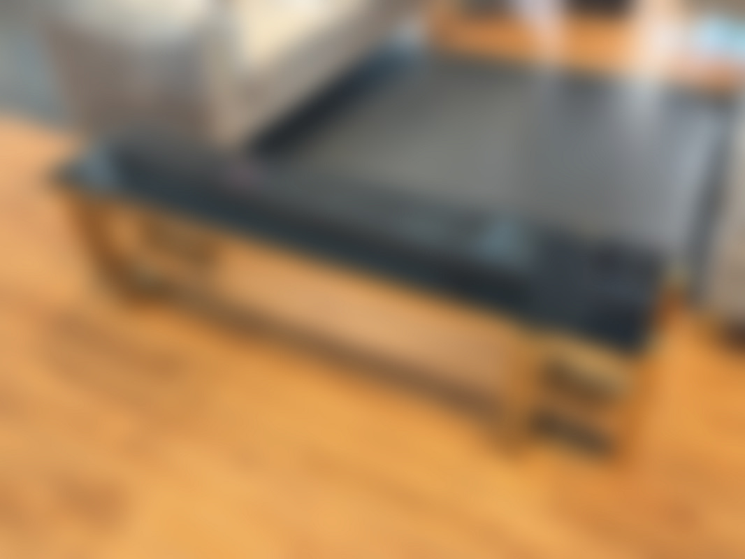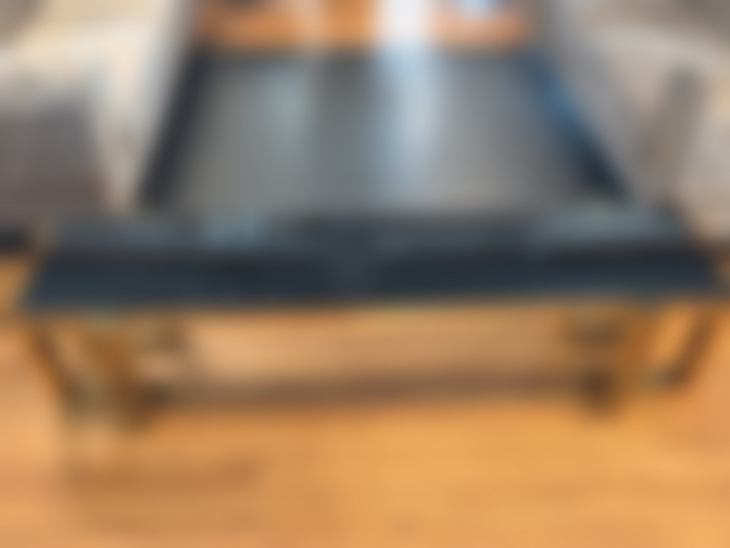 Not allowedTV-bänk/ sidobänk med stomme i guldfärgad metall och skiva i svart glas.