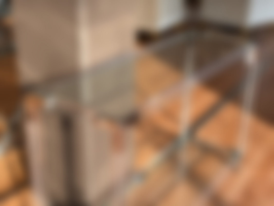 Not allowedSidobord med genomskinlig stomme, detaljer i metall och glasskivor.