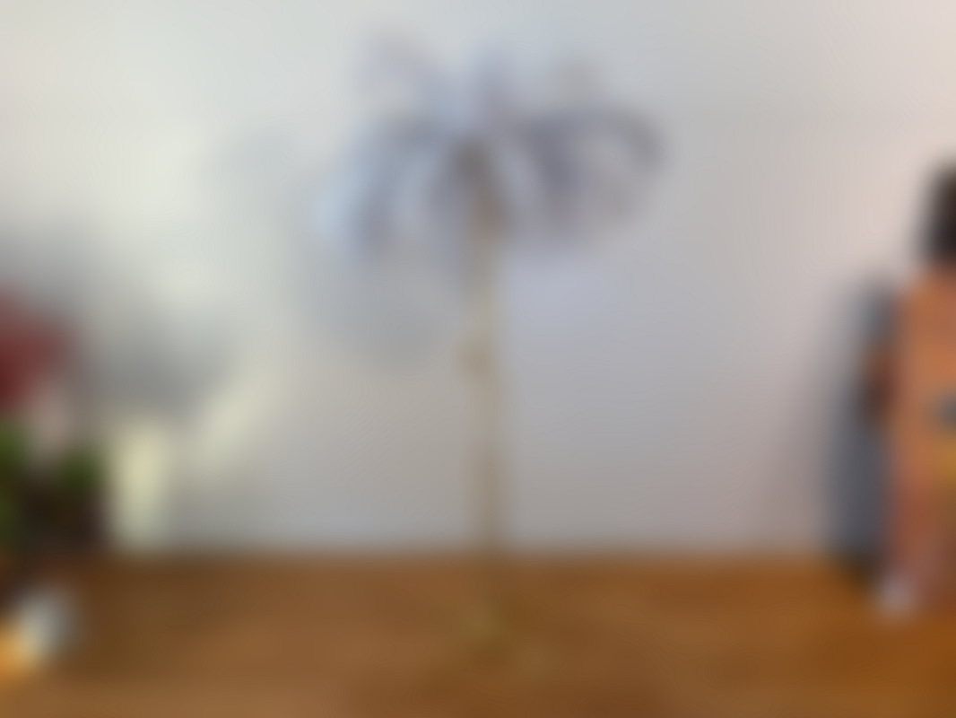 Not allowedGolvlampa med fjädrar och guldfärgad fot.