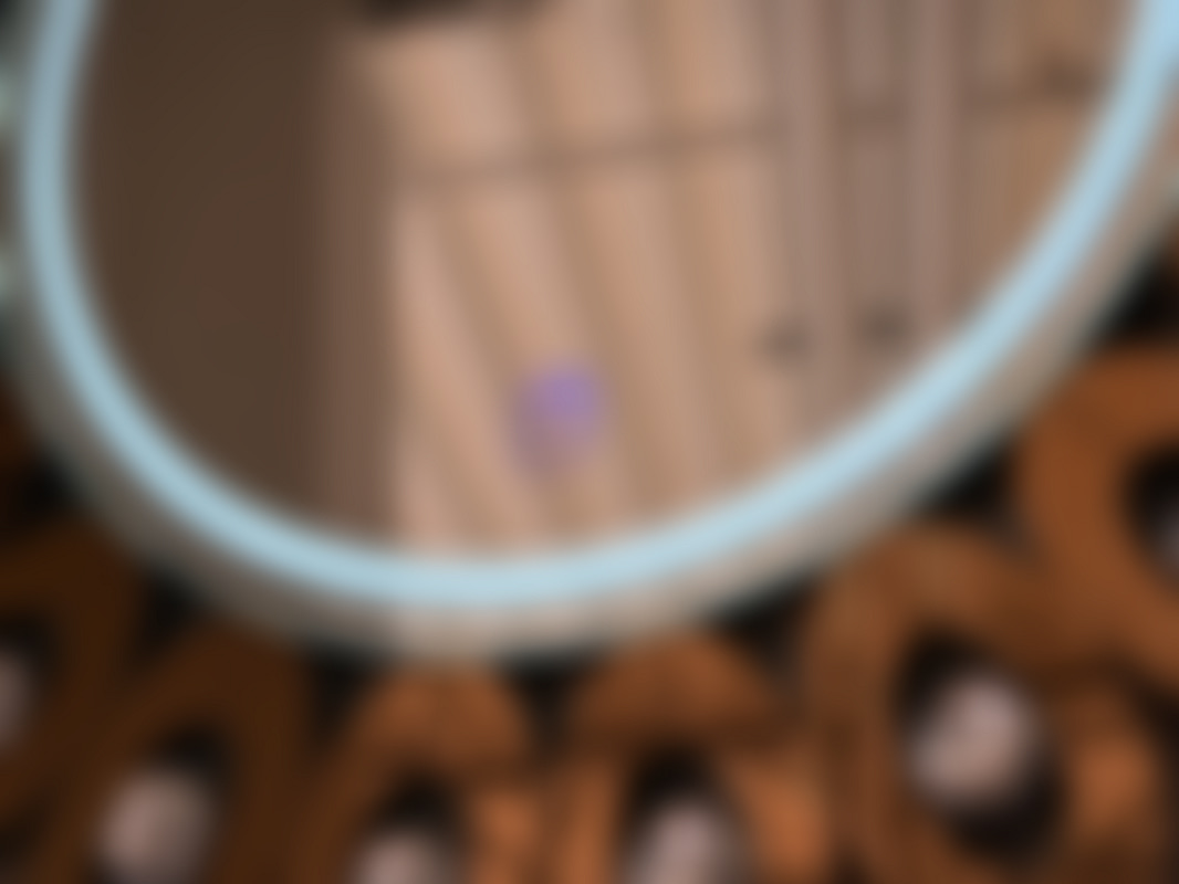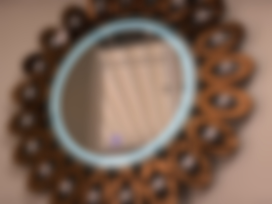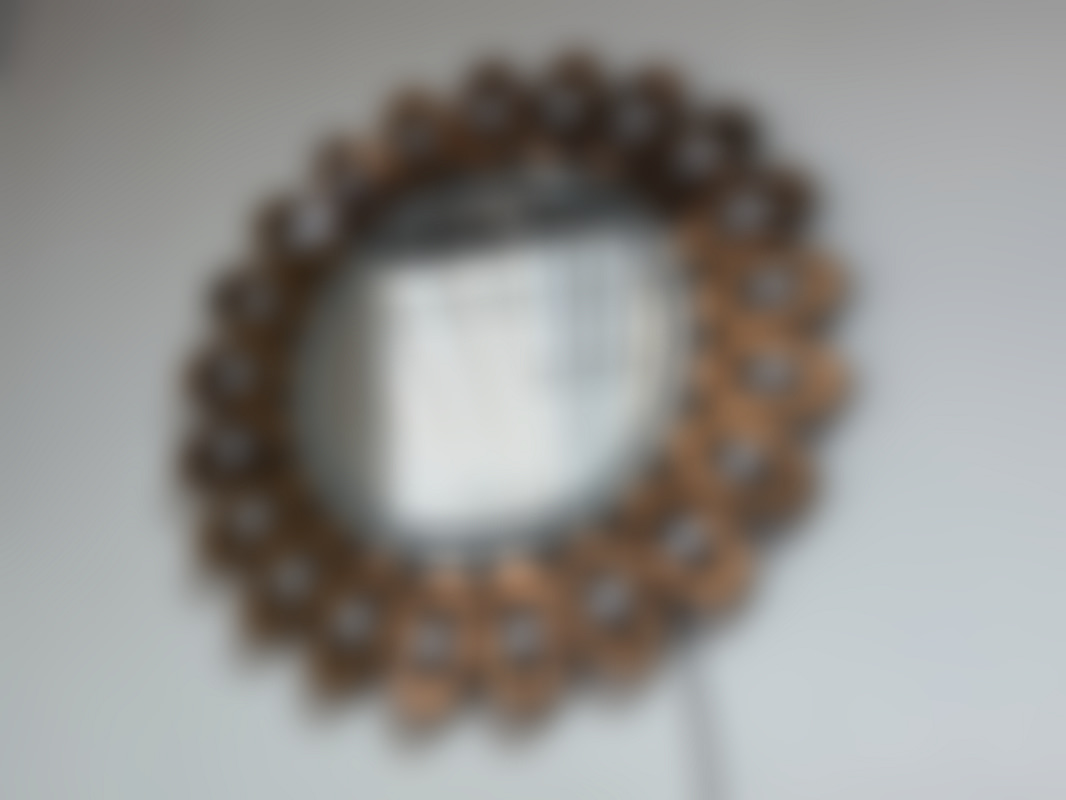 Not allowedRund spegel med belysning, med bronstonade detaljer runt kant.