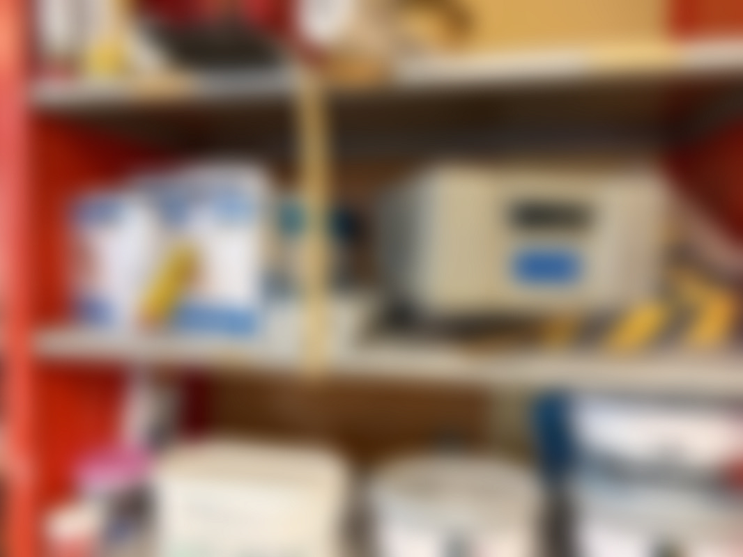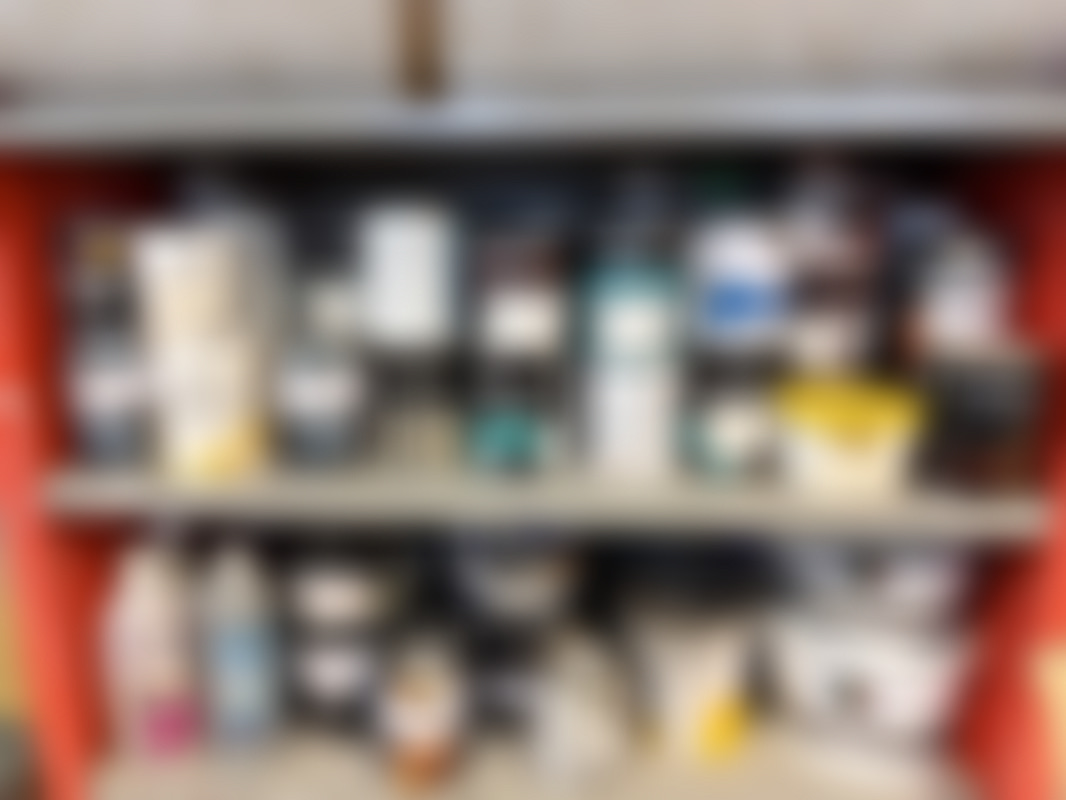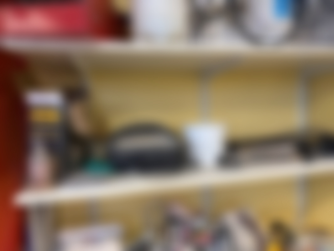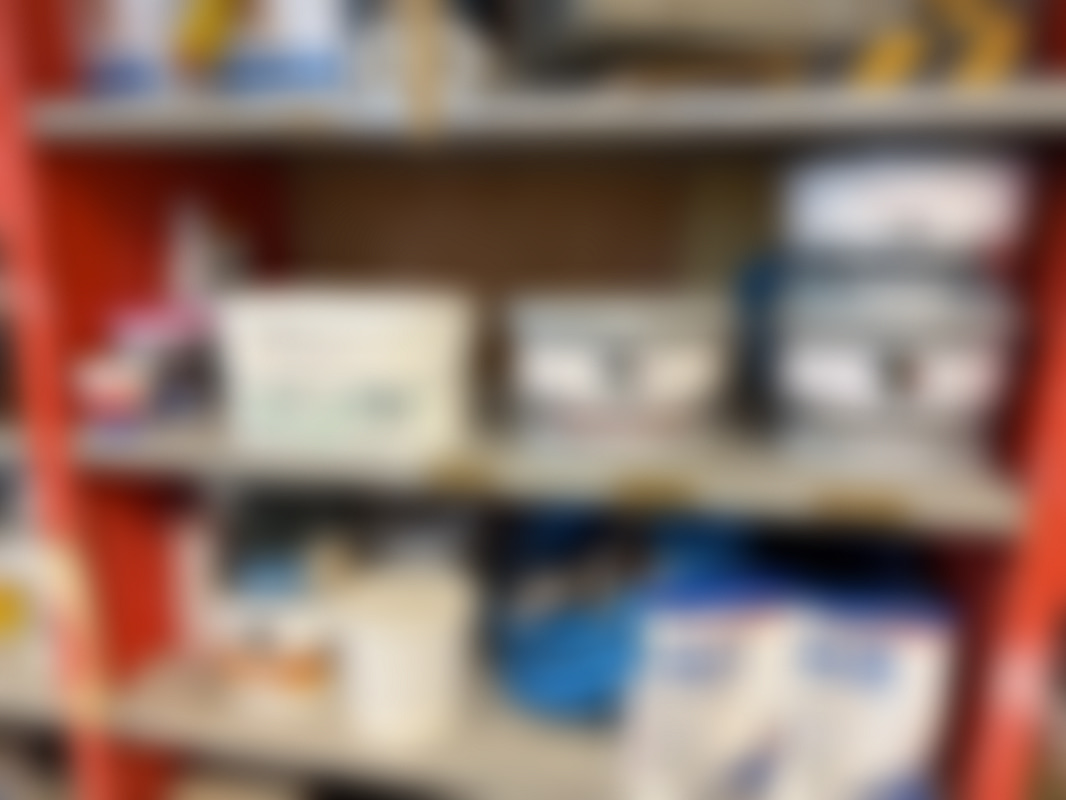 Plåthyllor med innehåll.