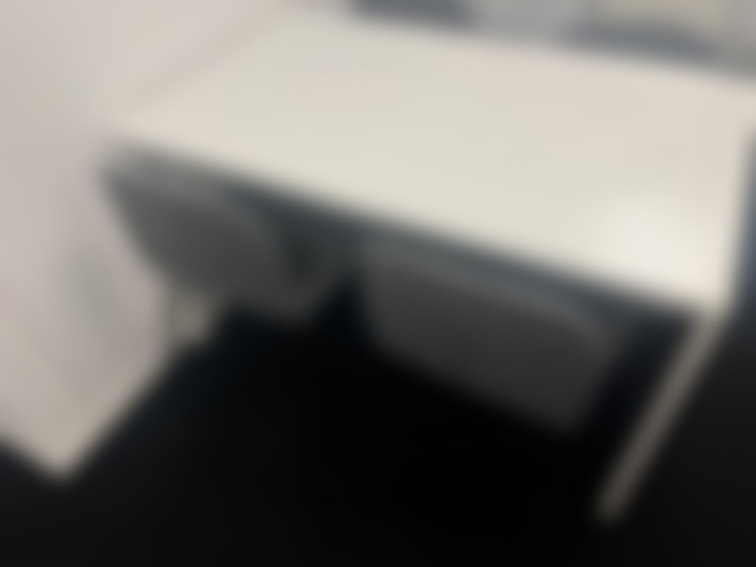 Vitt rektangulärt bord med fyra matchande stolar i grå tygklädsel. Passar utmärkt som mindre mötesbord, lunchbord eller arbetsbord i kontorsmiljö.