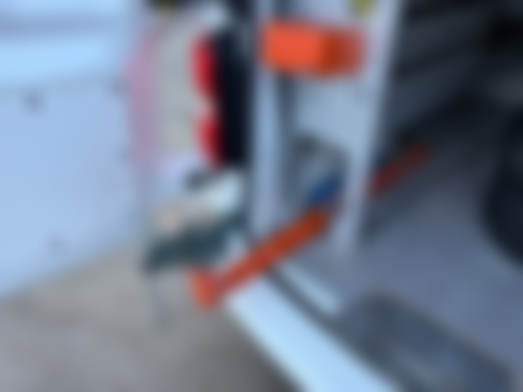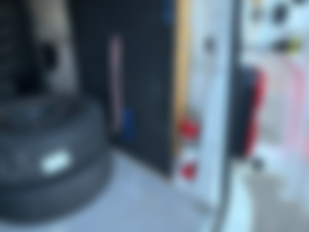 Inredning i skåp med skruvstäd och brandsläckare.