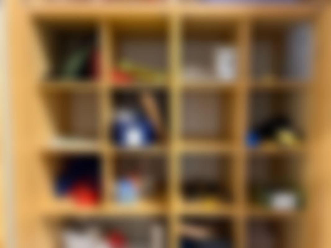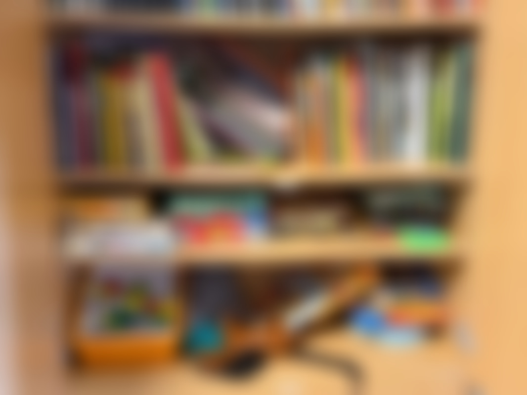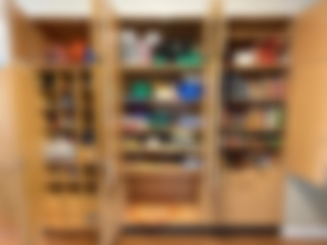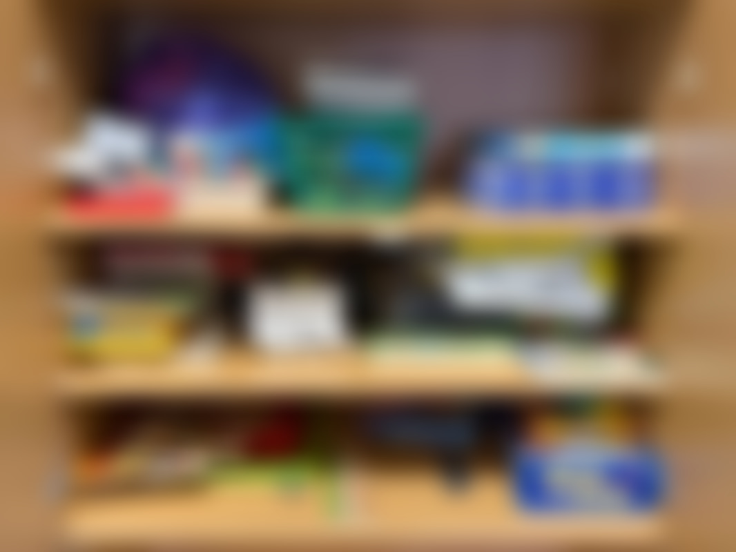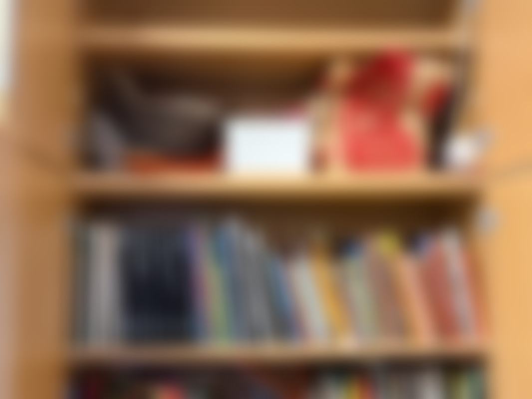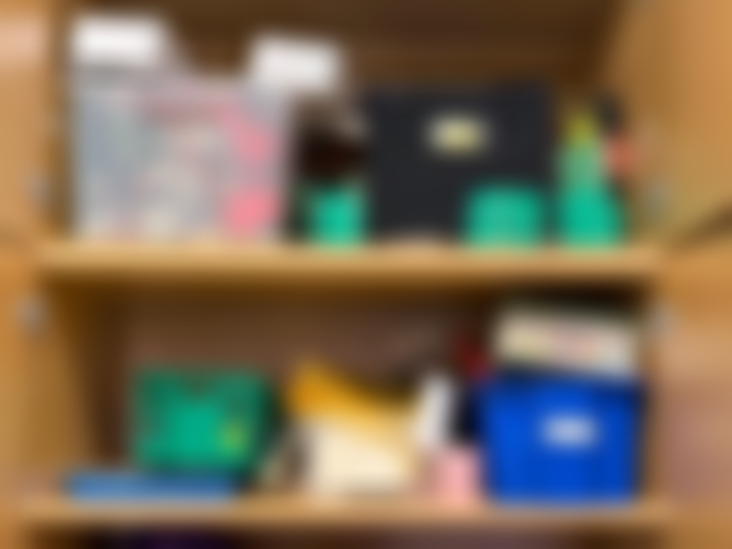 Not allowedParti diverse pyssel och böcker i skåp.