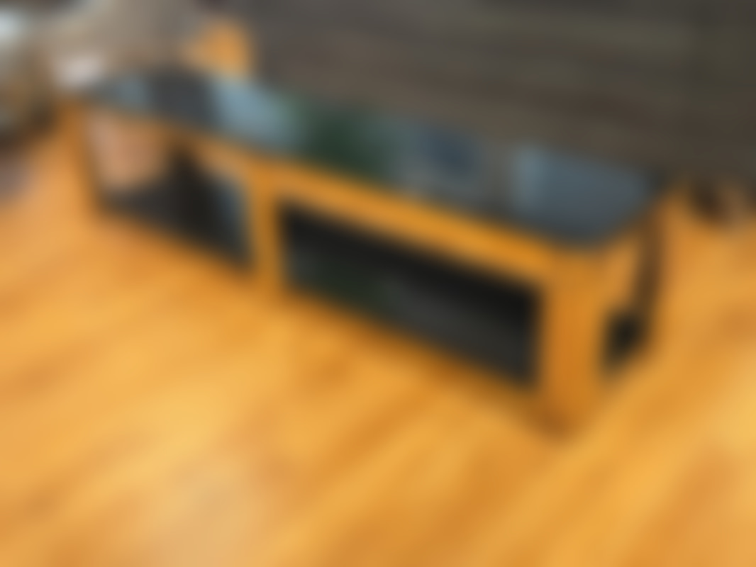 Not allowedTV-bänk/ sidobänk i guldfärgad metall med svarta glasskivor.