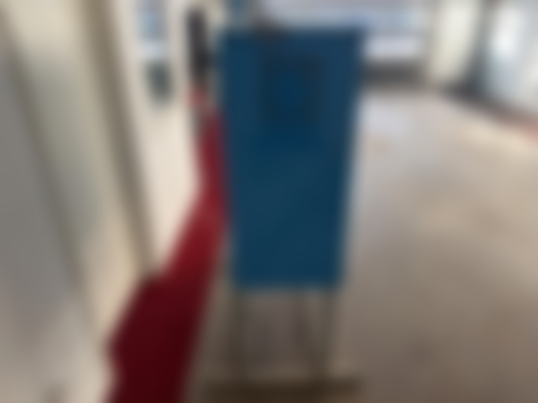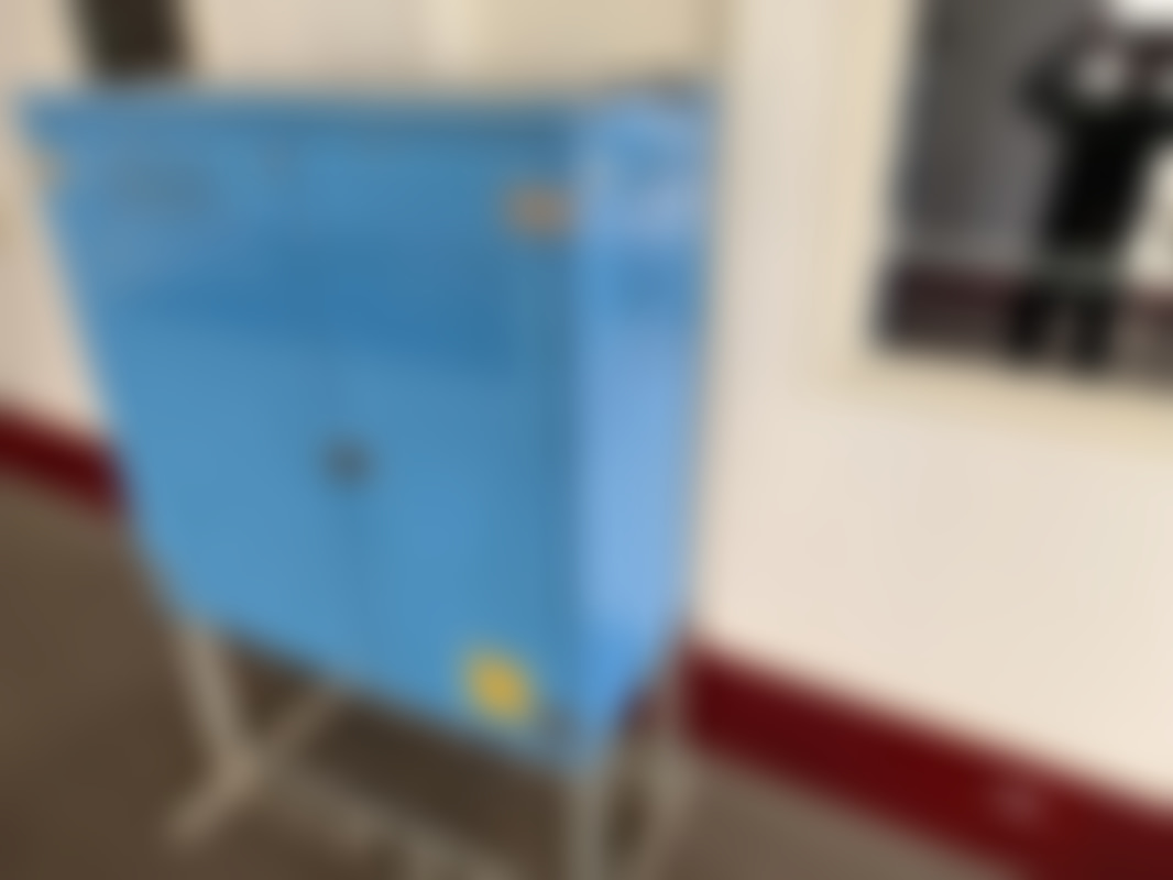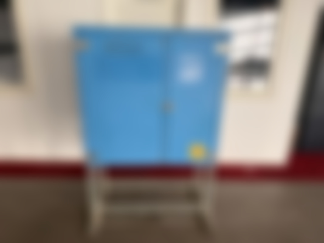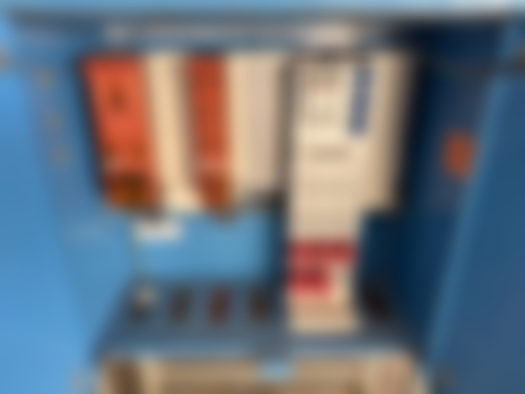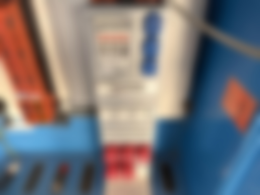 Not allowedEl-skåp/fördelningscentral från El-Björn i blå färg, monterat på metallställ. Innehåller brytare och säkringar för industriell elförsörjning, med märkskyltar för TN-C-S och TN-S-system.
