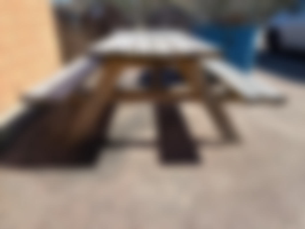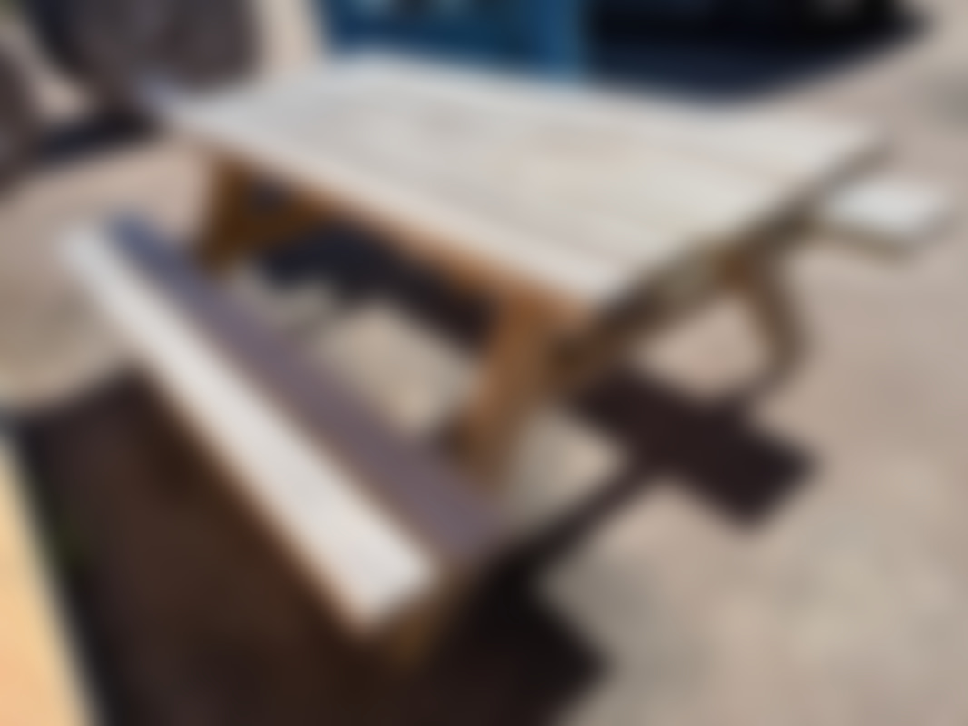 Not allowedKlassiskt picknickbord i trä med fasta bänkar.