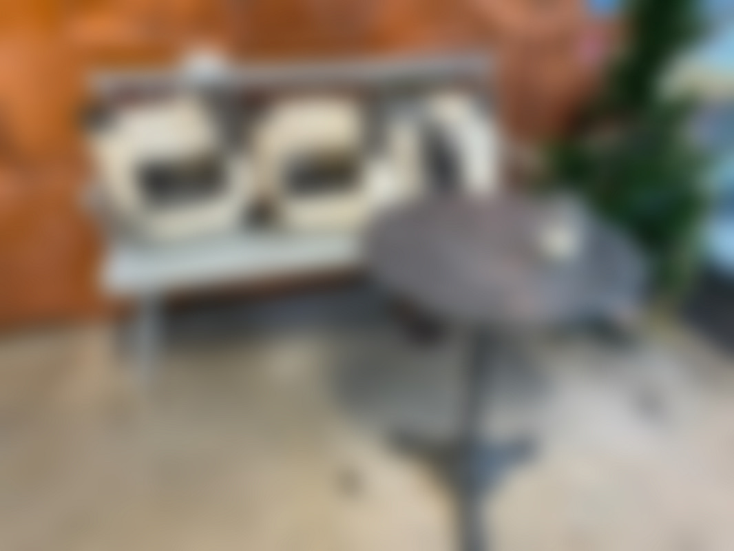 Träsofffa med kuddar samt cafebord med marmortop