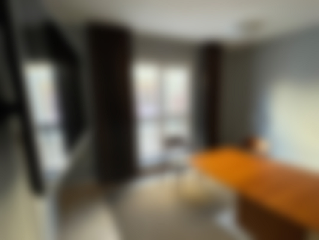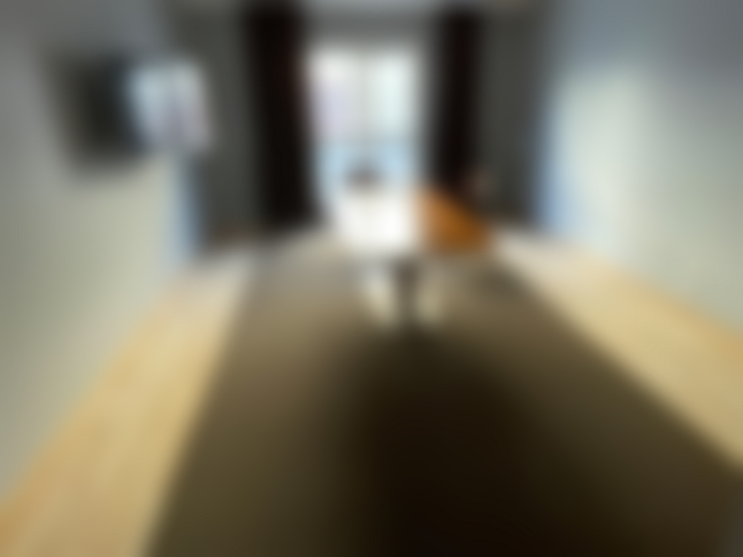 Konferensbord ink 2st karmstolar i trä och skinn, Väggmonterad Philips TV 50 tum, Matta, Gardiner