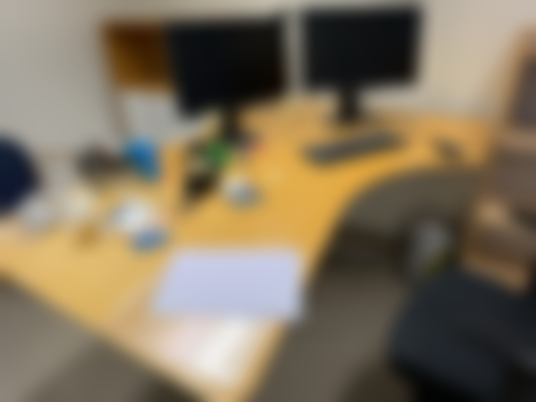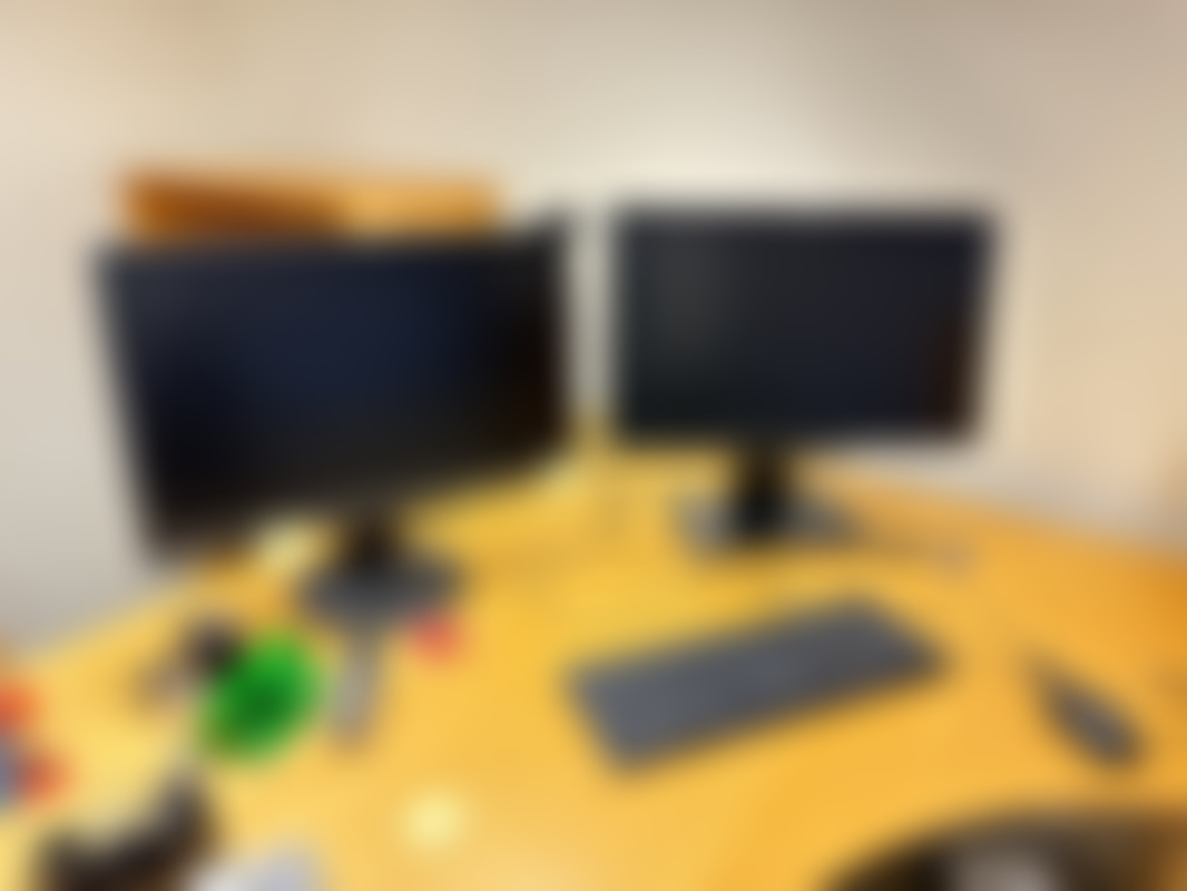 Elektriskt höj och sänkbart skrivbord 180x115cm, 2st Fujitsu datorskärmar, kontorsstol samt Jalusiskåp på hjul