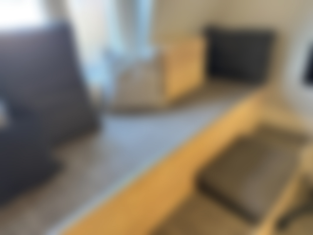 Fåtöljer blå sammet, färgglada kuddar samt sideboard